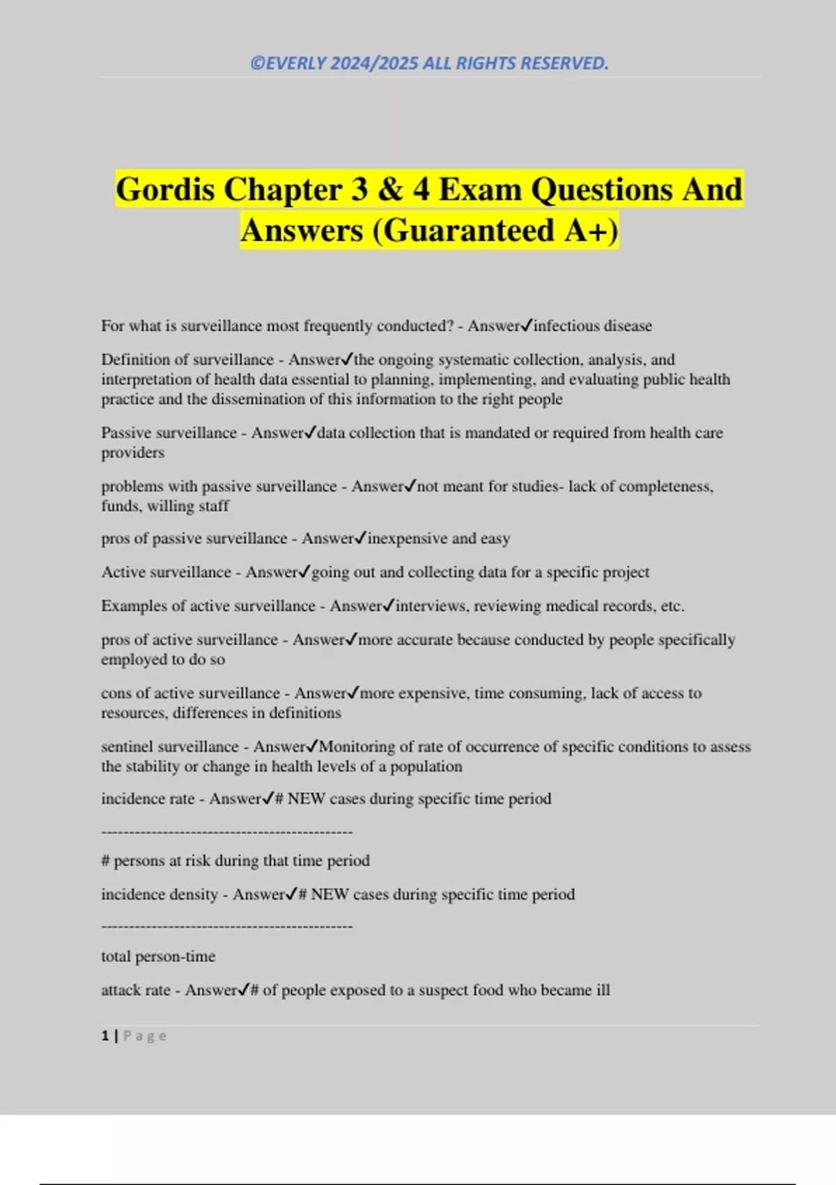 Gordis Chapter 3 & 4 Exam Questions And Answers (Guaranteed A+) For what is surveillance most frequently conducted? - Answerinfectious disease Definition of surveillance - Answerthe ongoing systematic collection, analysis, and interpretation of health data essential to planning, implementing, and evaluating public health practice and the dissemination of this information to the right people Passive surveillance - Answerdata collection that is mandated or required from health care providers problems with passive surveillance - Answernot meant for studies- lack of completeness, funds, willing staff pros of passive surveillance - Answerinexpensive and easy Active surveillance - Answergoing out and collecting data for a specific project Examples of active surveillance - Answerinterviews, reviewing medical records, etc. pros of active surveillance - Answermore accurate because conducted by people specifically employed to do so cons of active surveillance - Answermore expensive, time consuming, lack of access to resources, differences in definitions sentinel surveillance - AnswerMonitoring of rate of occurrence of specific conditions to assess the stability or change in health levels of a population incidence rate - Answer# NEW cases during specific time period --------------------------------------------- # persons at risk during that time period incidence density - Answer# NEW cases during specific time period --------------------------------------------- total person-time attack rate - Answer# of people exposed to a suspect food who became ill