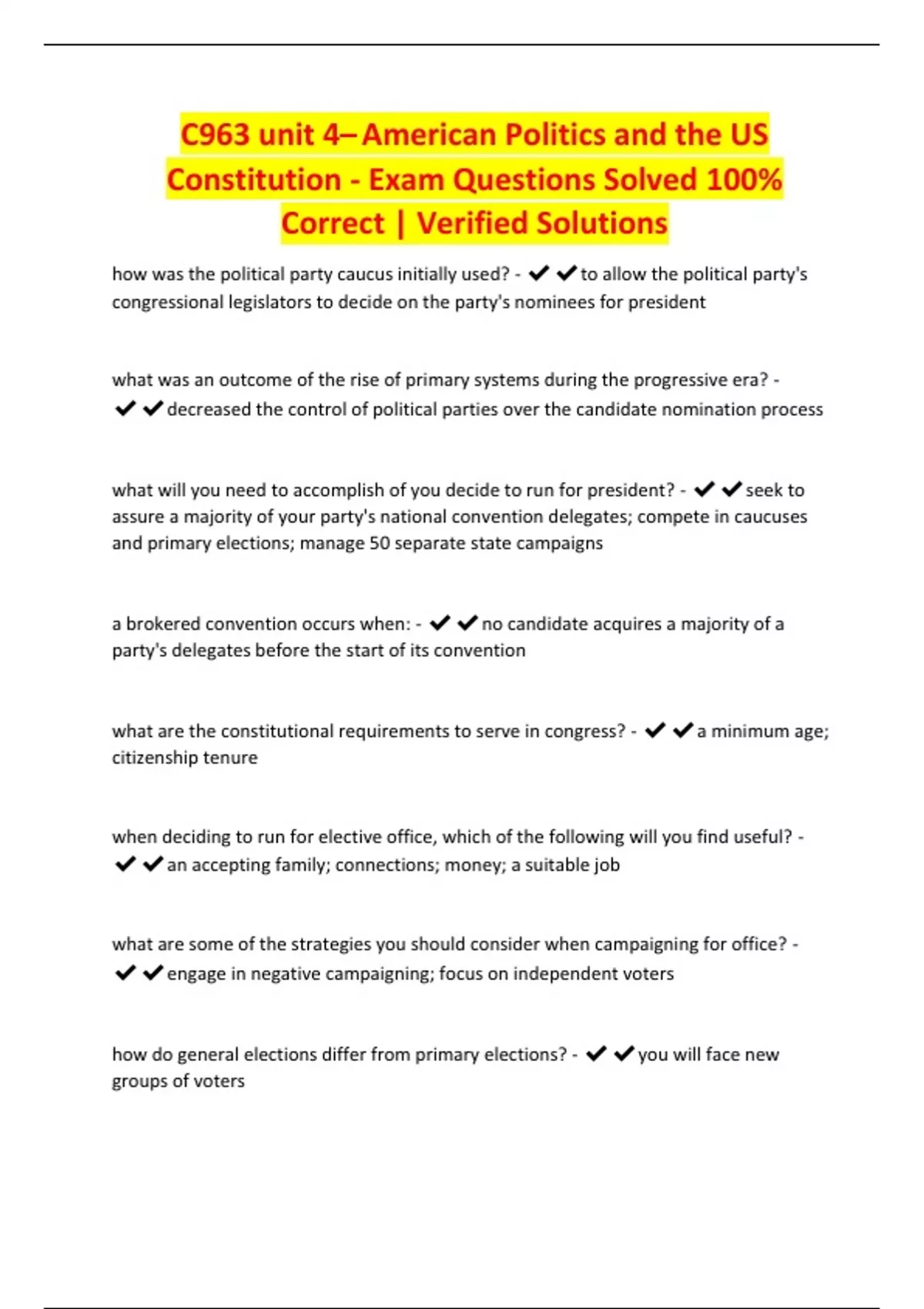 C963 unit 4– American Politics and the US Constitution - Exam Questions Solved 100% Correct | Verified Solutions