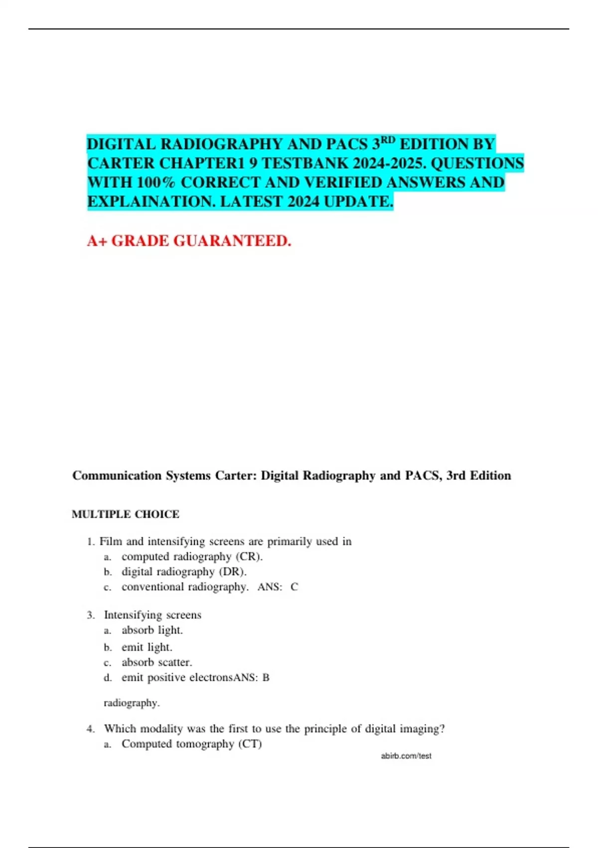 DIGITAL RADIOGRAPHY AND PACS 3RD EDITION BY CARTER CHAPTER1 9 TESTBANK . QUESTIONS WITH 100% CORRECT AND VERIFIED ANSWERS AND EXPLAINATION. LATEST 2024 UPDATE. A+ GRADE GUARANTEED.