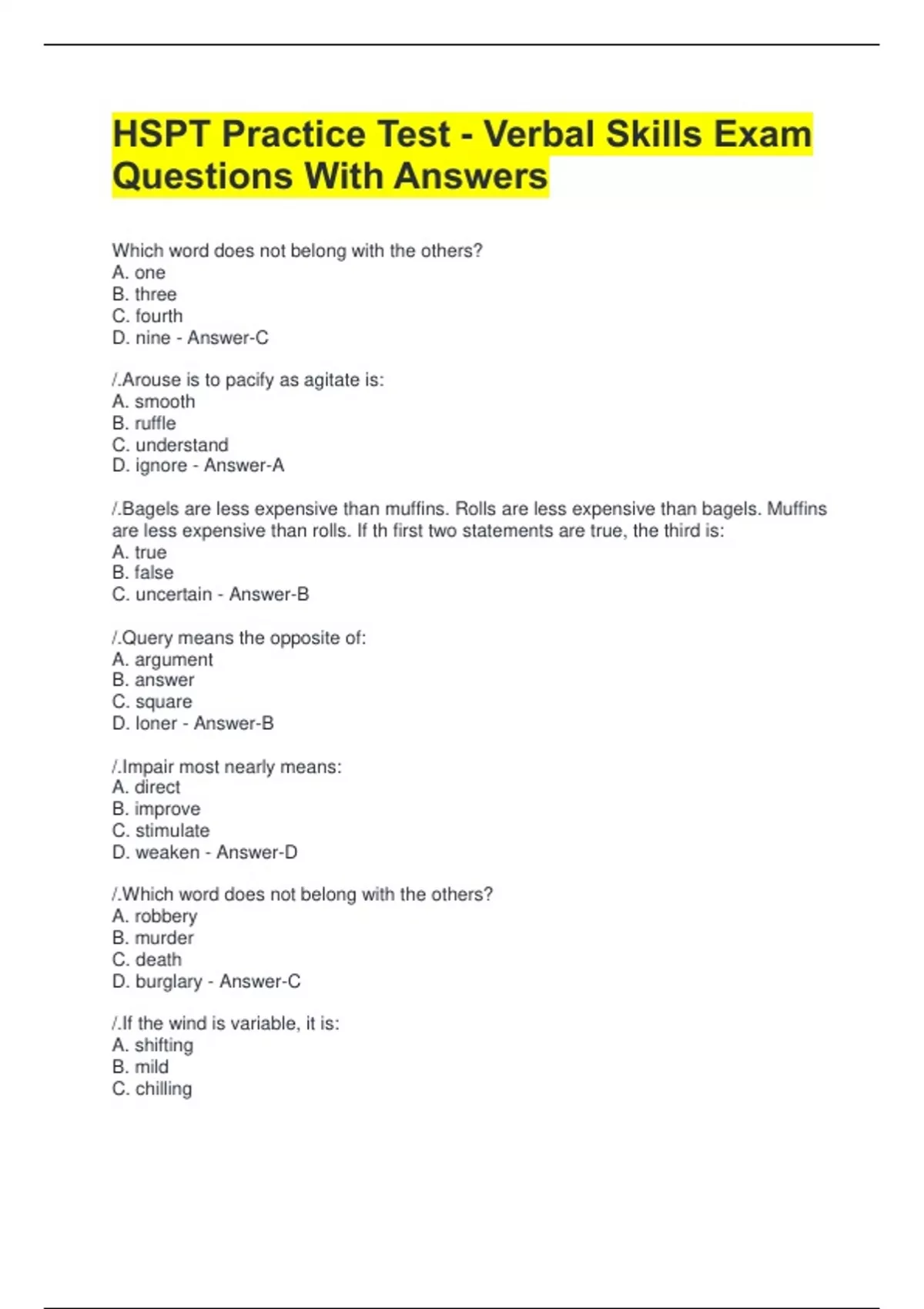 HSPT Practice Test - Verbal Skills Exam Questions With Answers Which word does not belong with the others? A. one B. three C. fourth D. nine - Answer-C /.Arouse is to pacify as agitate is: A. smooth B. ruffle C. understand D. ignore - Answer-A /.Bagels are less expensive than muffins. Rolls are less expensive than bagels. Muffins are less expensive than rolls. If th first two statements are true, the third is: A. true B. false C. uncertain - Answer-B /.Query means the opposite of: A. argument B. answer C. square D. loner - Answer-B /.Impair most nearly means: A. direct B. improve C. stimulate D. weaken - Answer-D /.Which word does not belong with the others? A. robbery B. murder C. death D. burglary - Answer-C /.If the wind is variable, it is: A. shifting B. mild C. chilling D. steady - Answer-A /.Egg is to beat as potato is to: A. yam B. bake C. eye D. mash - Answer-D /.If you obstruct the entrance to the building you: A. block it B. enter it C. leave it D. cross it - Answer-A /.Barbara has five nickels more than Barry. Jane has 15 cents less than Barbara. Barry has more money than Jane. If the first two statements are true the third is: A. true B. false C. uncertain - Answer-B /.Which word does not belong with the others? A. tuberculosis B. measles C. fever D. flu - Answer-C /.Cause means the opposite of: A. affect B. result C. question D. accident - Answer-B /.Skillful is to clumsy as deft is to: A. alert B. awkward C. dumb D. agile - Answer-B /.Which word does not belong with the others? A. tent B. igloo C. cabin D. cave - Answer-D /.Pepper is the shaggiest dog in the obedience school class. Pretzel is a dachshund. Pepper and Pretzel are in the same class. If the first two statements are true the third is: