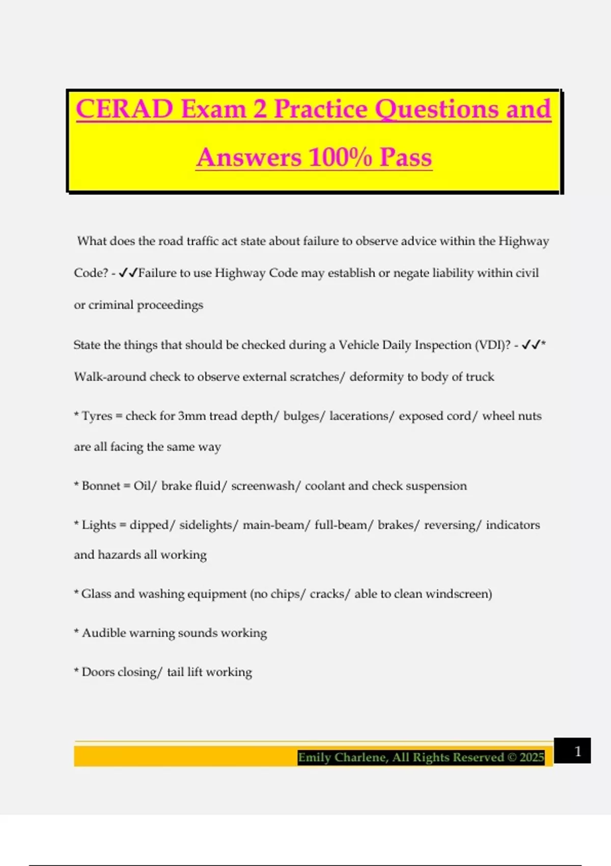 CERAD Exam 2 Practice Questions and Answers 100% Pass What does the road traffic act state about failure to observe advice within the Highway Code? - Failure to use Highway Code may establish or negate liability within civil or criminal proceedings State the things that should be checked during a Vehicle Daily Inspection (VDI)? - * Walk-around check to observe external scratches/ deformity to body of truck * Tyres = check for 3mm tread depth/ bulges/ lacerations/ exposed cord/ wheel nuts are all facing the same way * Bonnet = Oil/ brake fluid/ screenwash/ coolant and check suspension * Lights = dipped/ sidelights/ main-beam/ full-beam/ brakes/ reversing/ indicators and hazards all working * Glass and washing equipment (no chips/ cracks/ able to clean windscreen) * Audible warning sounds working * Doors closing/ tail lift working 2Emily Charlene, All Rights Reserved © 2025 * Ambo equipment If involved in a collision whilst driving an ambulance, do you have an obligation to inform your personal insurance company? - Yes, if you don't your insurance will be void Who has the greatest responsibility to reduce danger to others - the person with the largest vehicle Highway Code rule 89 states that your vehicle must comply with requirements of the Road Vehicles (Construction and Use) Regulations and what else? - Road Vehicles Lighting Regulations What is the definition of a road? - Any highway/ road to which the public has access and includes bridges over which a road passes Who is responsible for setting penalties for road traffic offences? - Parliament (The courts then serve the penalties) Failure to rectify vehicle defects can result in penalty points on a driving license, True or False? - True Driving standards required by law as per road traffic act 1998... What are they? - If a person drives a mechanically propelled vehicle without due care/ lack of consideration for other people, he is guilty of offence 3Emily Charlene, All Rights Reserved © 2025 Those found guilty of death by dangerous driving will be given a custodial sentence no matter the mitigating factors, true or false? - True How many penalty points can a driver accumulate within a 3 year period before they get disqualified from dangerous driving? - 12 points What's the correct order fro a pre-driver check? - 1. Handbrake and gear 2. Seat adjustment and steering wheel 3. Mirrors 4. Perform starting procedure How many penalty points can be given for each vehicl