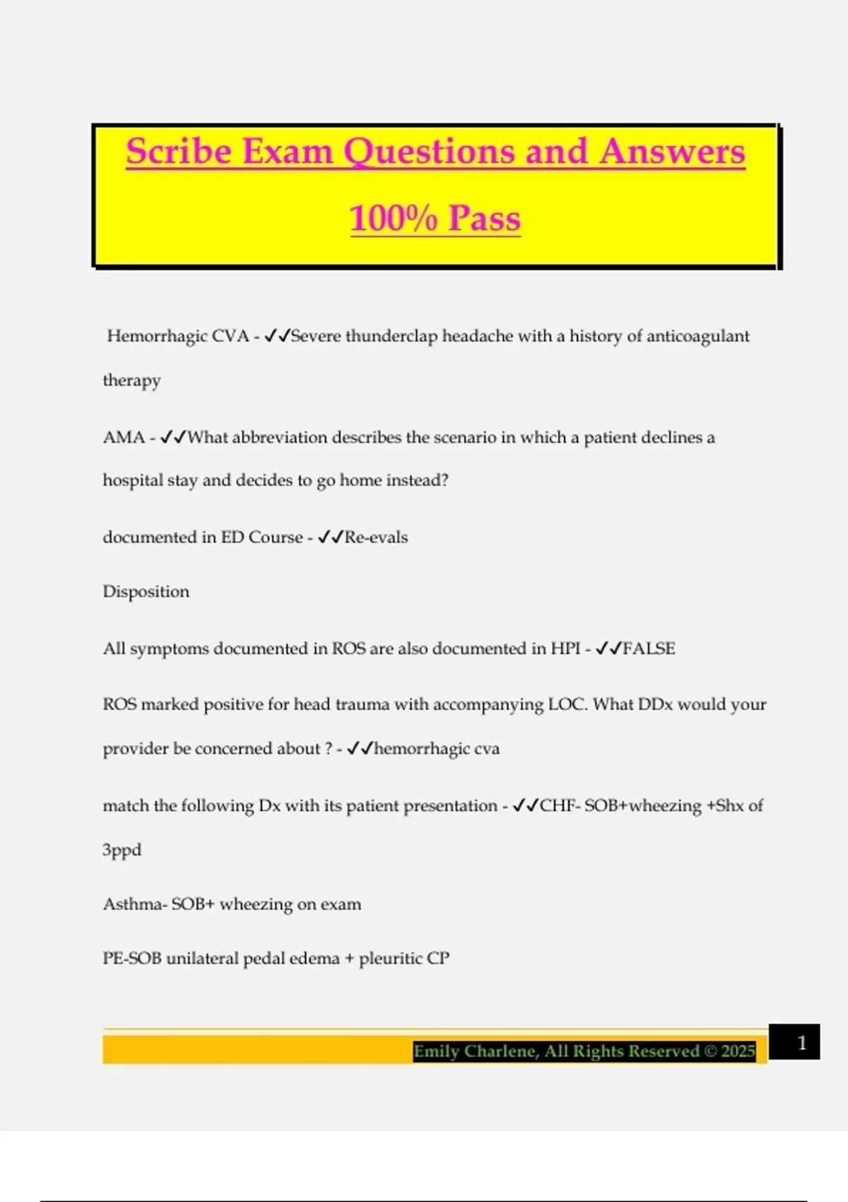 Scribe Exam Questions and Answers 100% Pass Hemorrhagic CVA - Severe thunderclap headache with a history of anticoagulant therapy AMA - What abbreviation describes the scenario in which a patient declines a hospital stay and decides to go home instead? documented in ED Course - Re-evals Disposition All symptoms documented in ROS are also documented in HPI - FALSE ROS marked positive for head trauma with accompanying LOC. What DDx would your provider be concerned about ? - hemorrhagic cva match the following Dx with its patient presentation - CHF- SOB+wheezing +Shx of 3ppd Asthma- SOB+ wheezing on exam PE-SOB unilateral pedal edema + pleuritic CP 2Emily Charlene, All Rights Reserved © 2025 COPD- SOB + bilateral pedal edema+Cp Pregnant four times, 3 children at home, and not currently pregnant - 4,3,1 Pregnant four times in the past, currently pregnant, and has two children at home - 5,2,2 Normal grading scale - strength- 5/5 GCS- 2+ Reflexes- 15 Match the location with the appropriate pulse that you would document in the physical exam - wrist- 2+ radial pulse neck- 2+ carotid top of foot- 2+ DDP back of foot- 2+ PTP match the following results with the corresponding diagnosis - blood work- no MI combination - EKG and + blood work= NSTEMI combination +EKG and + blood work= STEMI 3Emily Charlene, All Rights Reserved © 2025 HPI Elements - Onset (when did it begin), timing (constant, intermittent, waning), location, quality (sharp, dull, aching), severity (0-10), modifying factors (what makes it better/worse), associated Sx, context (anything else important) Scleral icterus - eye Among the following diseases listed select the ones that qualify for CCT - ACS CVA Afib Acute MI DKA