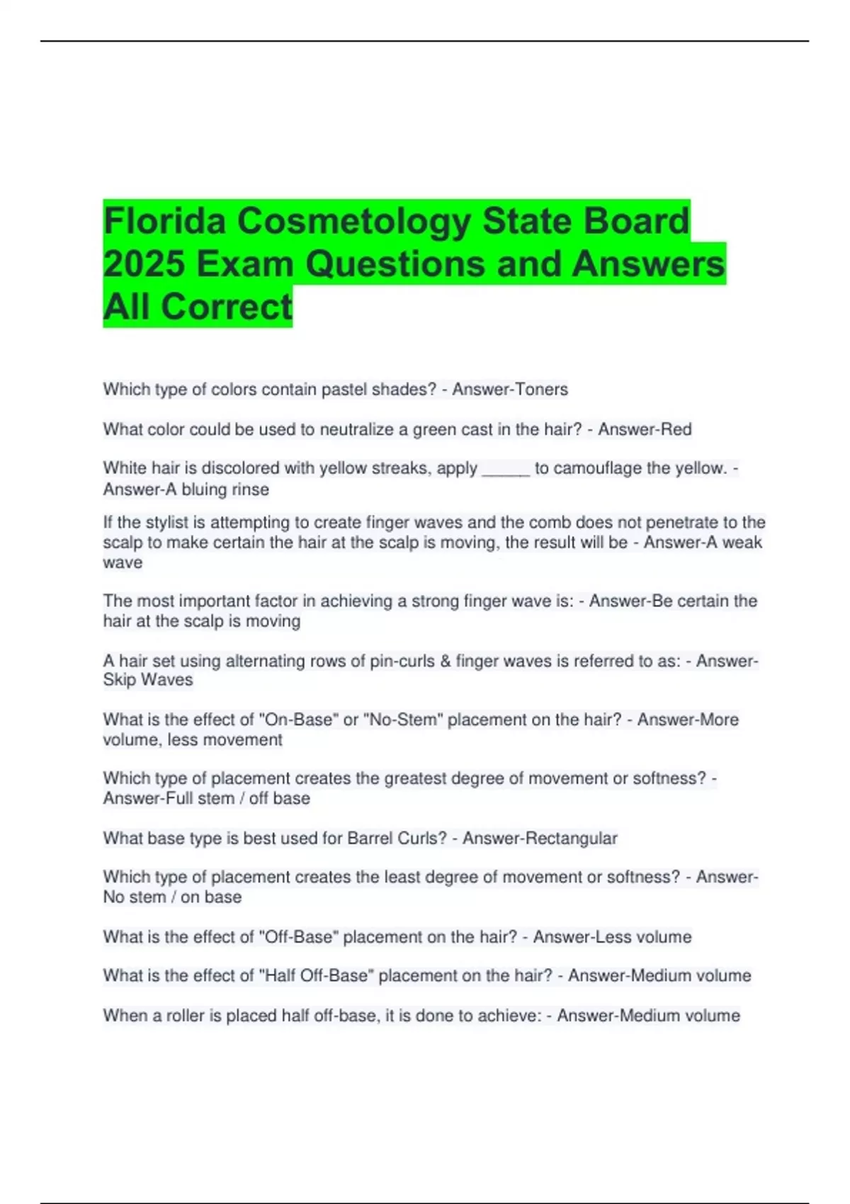 Florida Cosmetology State Board 2025 Exam Questions and Answers All Correct Which type of colors contain pastel shades? - Answer-Toners What color could be used to neutralize a green cast in the hair? - Answer-Red White hair is discolored with yellow streaks, apply _____ to camouflage the yellow. - Answer-A bluing rinse If the stylist is attempting to create finger waves and the comb does not penetrate to the scalp to make certain the hair at the scalp is moving, the result will be - Answer-A weak wave The most important factor in achieving a strong finger wave is: - Answer-Be certain the hair at the scalp is moving A hair set using alternating rows of pin-curls & finger waves is referred to as: - Answer-Skip Waves What is the effect of "On-Base" or "No-Stem" placement on the hair? - Answer-More volume, less movement Which type of placement creates the greatest degree of movement or softness? - Answer-Full stem / off base What base type is best used for Barrel Curls? - Answer-Rectangular Which type of placement creates the least degree of movement or softness? - Answer-No stem / on base What is the effect of "Off-Base" placement on the hair? - Answer-Less volume What is the effect of "Half Off-Base" placement on the hair? - Answer-Medium volume When a roller is placed half off-base, it is done to achieve: - Answer-Medium volume What is the best method to handle your shears if you stop cutting momentarily: - Answer-Palm them, closed, facing the stylist A "no stem" pin-curl, or an "on base" roller set, creates: - Answer-Tight, firm, long lasting curl To create a tight, firm, long lasting curl, use: - Answer-No stem curls On base curls - Answer-To create a tight, firm, long lasting curl, use: A No-Stem curl, would be the equivalent of a / an: - Answer-On base curl Which of the following is the most correct: - Answer-on base = no stem half off base=half stem off base= full stem To place your curl directly on-base and produce a tight, long lasting curl, you would use: - Answer-Over direction Which of the following would create the firmest curl with the strongest wave pattern: - Answer-No stem / On base A pin-curl will receive both its direction and mobility from its: - Answer-Stem Which of the following would create a curl with the weakest/loosest wave pattern: - Answer-Full stem / Off base If the client seeks loose curls or waves with the greatest movement or mobility, use: - Answer-Off base or full stem curls Which placement would create a strong curl pattern, with looseness in the finished set: - Answer-Half stem / Half off base When you have combinations of pin-curls and finger waves, this pattern is referred to as: - Answer-Skip Waves If the stem direction is going towards the client's face, it is referred to as: - Answer-Forward movement Oxidation occurs during which of the following periods: - Answer-Neutralization For maximum volume, use: - Answer-On base, no stem Stand up pin-curls are often referred to as: - Answer-Barrel curls In a roller-set, the part of the hair/curl closest to the head is referred to as the: - Answer-Closed end When doing a roller (wet) set, what should be the width of the parting? - Answer-Same size as the roller In a wet set, which of the following placements would result in the least volume? - Answer-Off base In a pin-curl set, which of the following placements creates maximum volume? - Answer-No stem Which of the following takes longer to rinse from your client's hair: - Answer-Acid perm Which permanent wave will cause the least swelling /opening of the cuticle: - Answer-Acid Wave Triangular shaped bases in a pin-curl set can be used to: - Answer-Avoid any splits in the dried style Which of the following takes the least time to rinse from your client's hair: - Answer-Ammonium thioglycolate perm During which period in the permanent wave process does oxidation occur? - Answer-Neutralizing Reduction occurs during which of the following periods: - Answer-Processing During which period in the permanent wave process does oxidation occur? - Answer-Neutralizing and rebonding Curling the hair from the scalp to the ends is referred to as: - Answer-Spiral In a permanent wave, the diameter of the rod will determine the: - Answer-Size of the curl Which type of shampoo may increase porosity and hasten color fading: - Answer-Volumizing In hair coloring, the word "Complimentary", means the same as: - Answer-Opposite What is 20 volume hydrogen peroxide equivalent to? - Answer-0.06 What is 40 volume hydrogen peroxide equivalent to? - Answer-0.12 What is the "Complimentary" color for yellow? - Answer-Violet