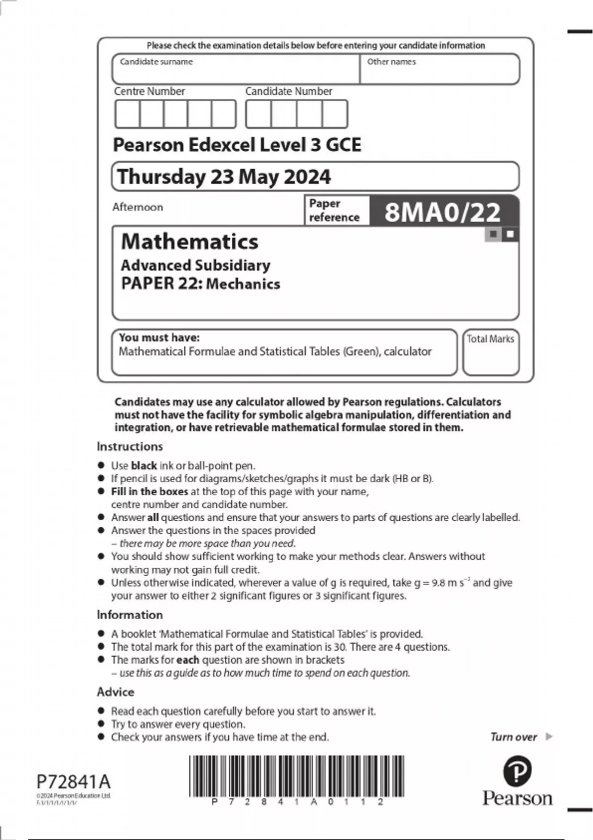 EDEXCEL AS LEVEL MATHS MECHANICS PAPER 2 JUNE 2024 (8MA022)