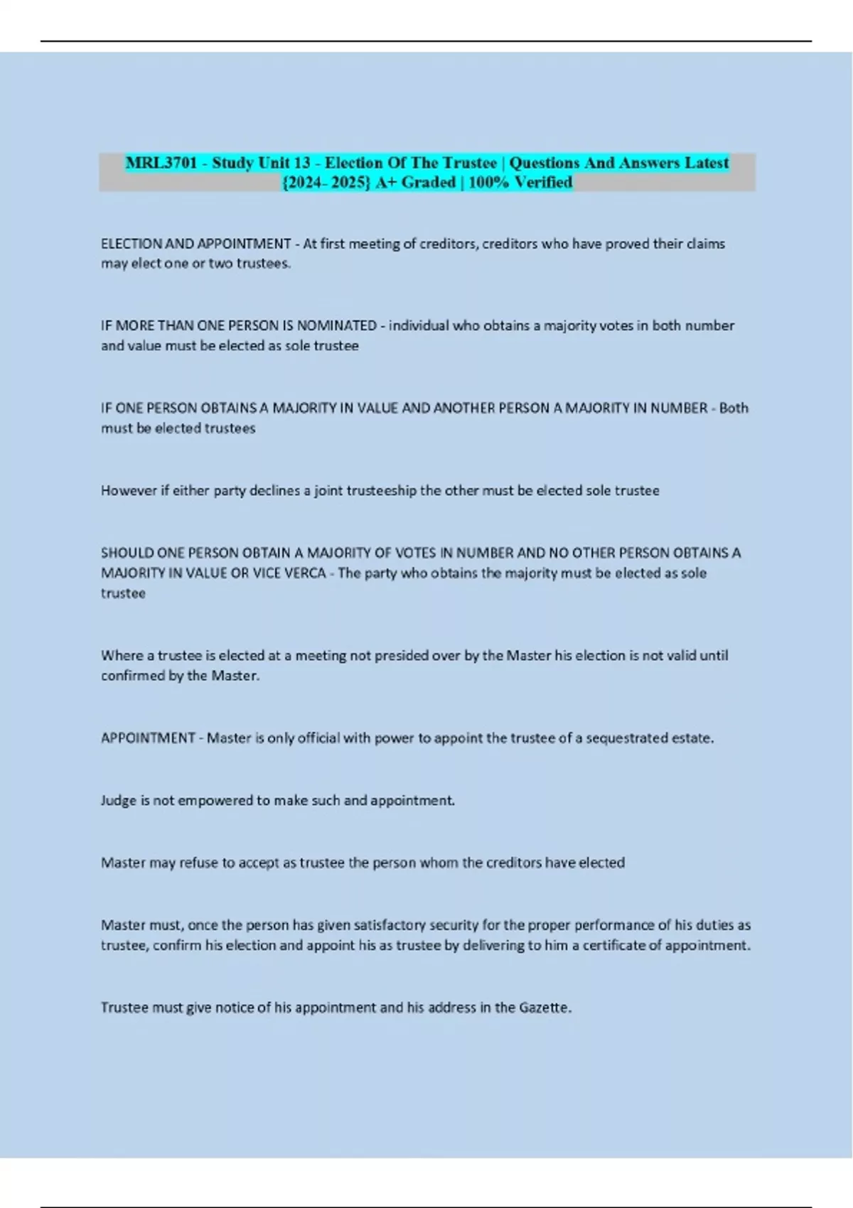 MRL3701 - Study Unit 13 - Election Of The Trustee | Questions And Answers
