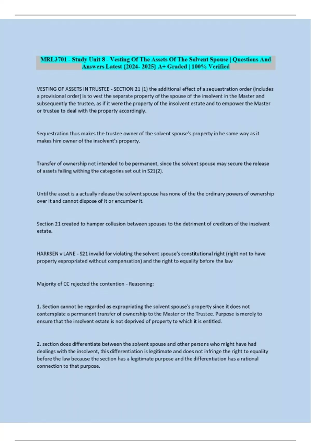 MRL3701 - Study Unit 8 - Vesting Of The Assets Of The Solvent Spouse | Questions And Answers