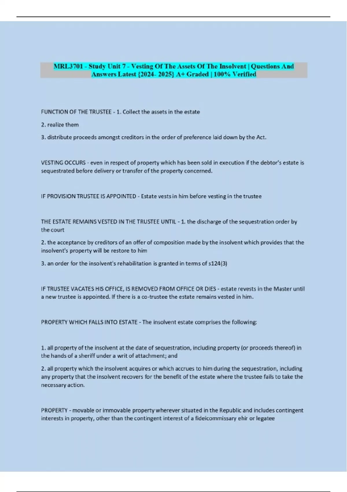 MRL3701 - Study Unit 7 - Vesting Of The Assets Of The Insolvent | Questions And Answers