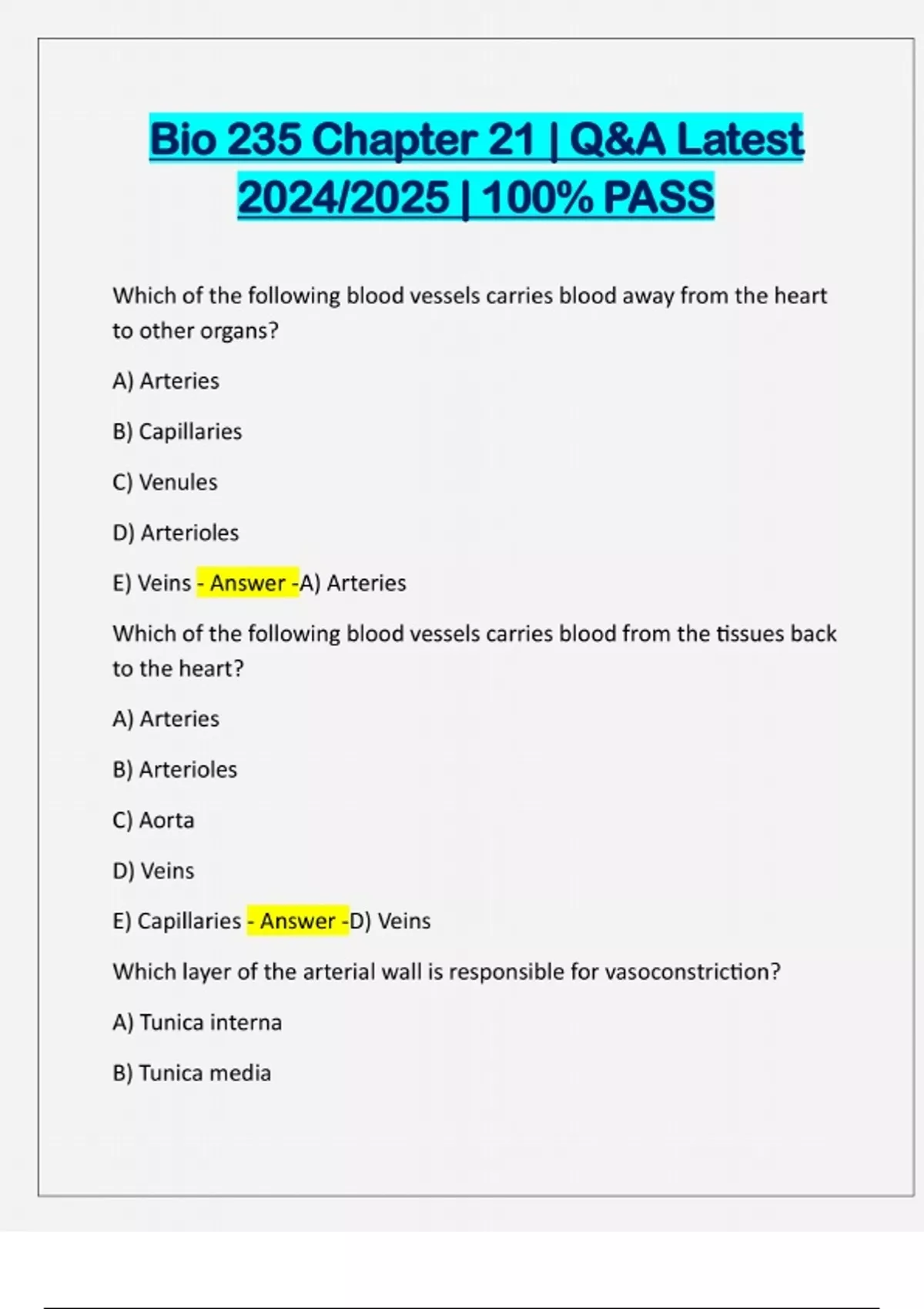 Bio 235 Chapter 21 | Q&A Latest 2024/2025 | 100% PASS Which of the following blood vessels carries blood away from the heart to other organs? A) Arteries B) Capillaries C) Venules D) Arterioles E) Veins - Answer -A) Arteries Which of the following blood vessels carries blood from the tissues back to the heart? A) Arteries B) Arterioles C) Aorta D) Veins E) Capillaries - Answer -D) Veins Which layer of the arterial wall is responsible for vasoconstriction? A) Tunica interna B) Tunica mediaC) Tunica Externa D) Tunica Albuginea E) Tunica Fascia - Answer -B) Tunica media Which layer of the arterial wall is primarily composed of elastic and collagen fibers? A) Tunica interna B) Tunica media C) Tunica Externa D) Tunica Albuginea