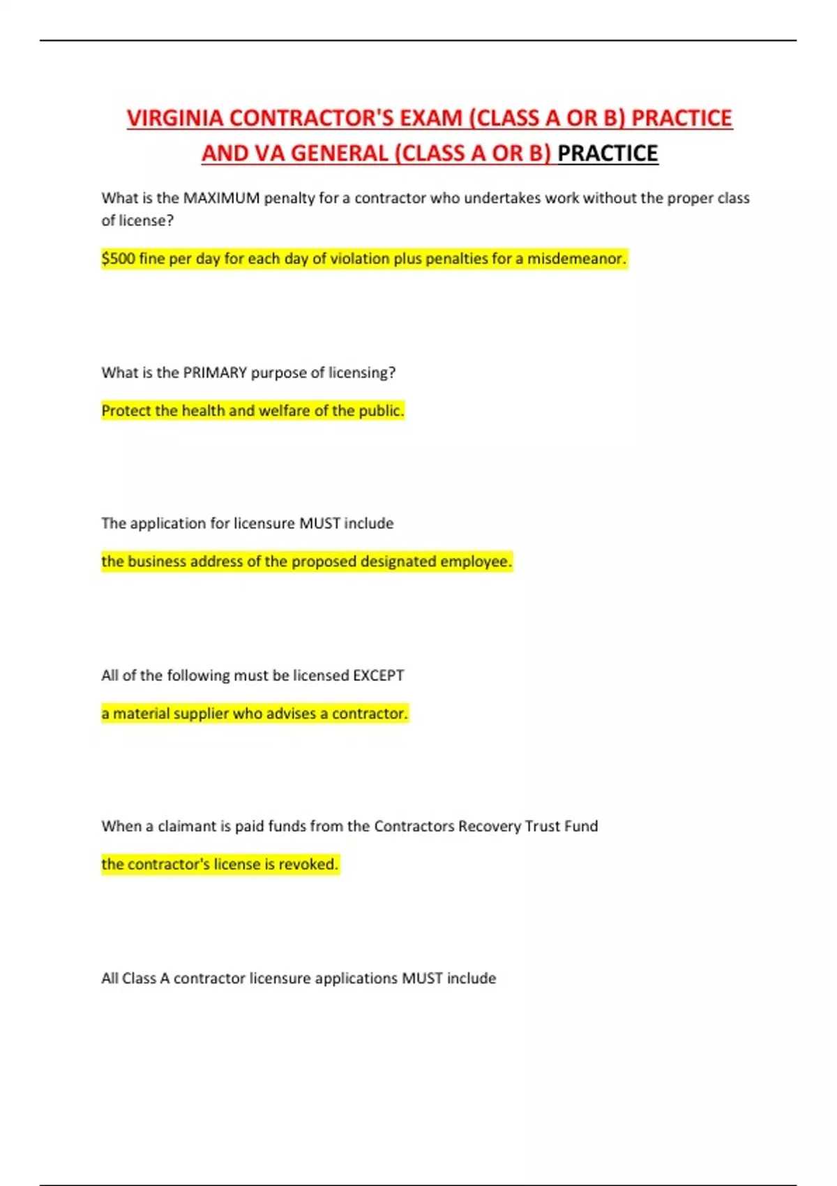 VIRGINIA CONTRACTOR'S EXAM (CLASS A OR B) PRACTICE