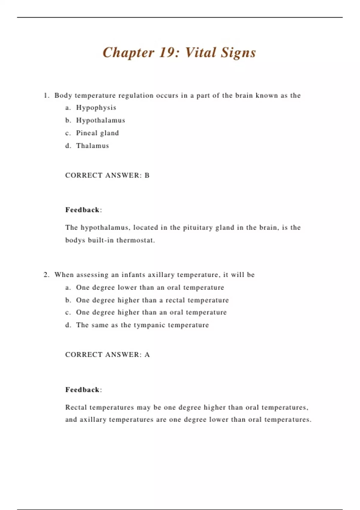 1. Body temperature regulation occurs in a part of the brain known as the a. Hypophysis b. Hypothalamus c. Pineal gland d. Thalamus CORRECT ANSWER: B Feedback: The hypothalamus, located in the pituitary gland in the brain, is the bodys built-in thermostat. 2. When assessing an infants axillary temperature, it will be a. One degree lower than an oral temperature b. One degree higher than a rectal temperature c. One degree higher than an oral temperature d. The same as the tympanic temperature CORRECT ANSWER: A Feedback: Rectal temperatures may be one degree higher than oral temperatures, and axillary temperatures are one degree lower than oral temperatures. 3. The temperature is 102 during a heat wave. The nurse can expect admissions to the emergency room to present with a. Increased temperature b. Increased cardiac output c. Decreased heart rate d. Decreased respirations