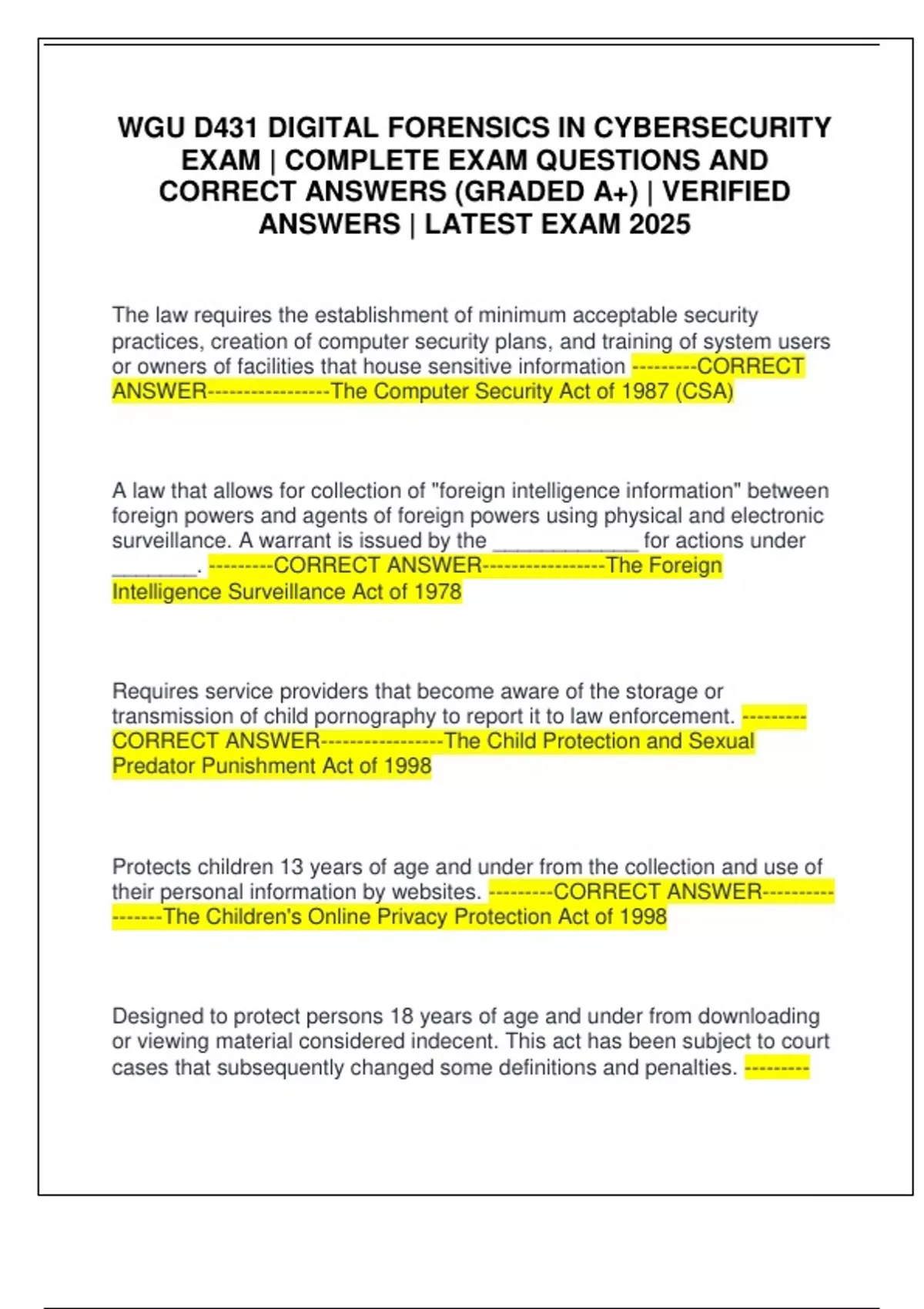 WGU D431 DIGITAL FORENSICS IN CYBERSECURITY EXAM | COMPLETE EXAM QUESTIONS AND CORRECT ANSWERS (GRADED A+) | VERIFIED ANSWERS | LATEST EXAM 2025