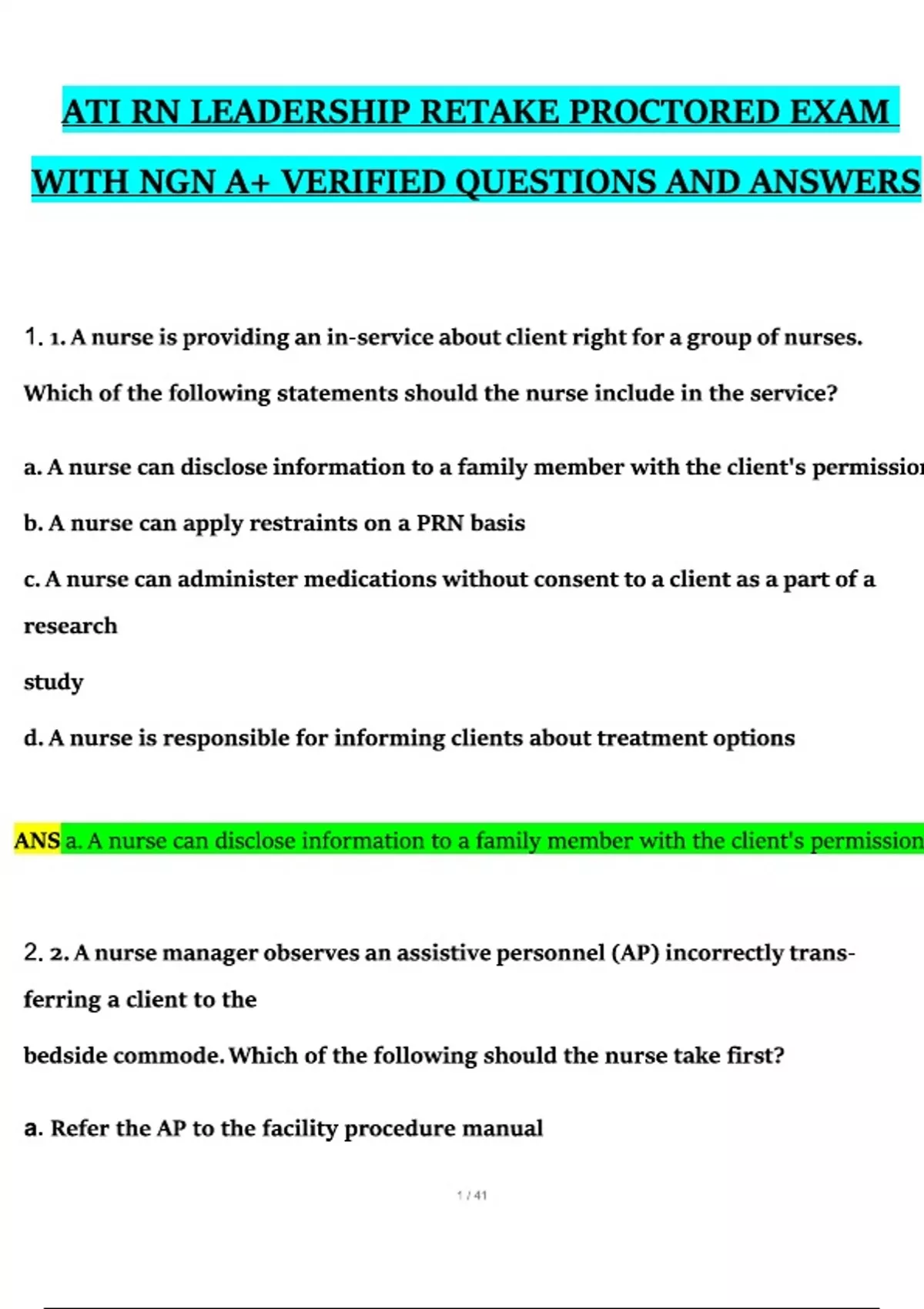 ATI RN LEADERSHIP RETAKE PROCTORED EXAM WITH A+ VERIFIED QUESTIONS AND ANSWERS ( V2 )