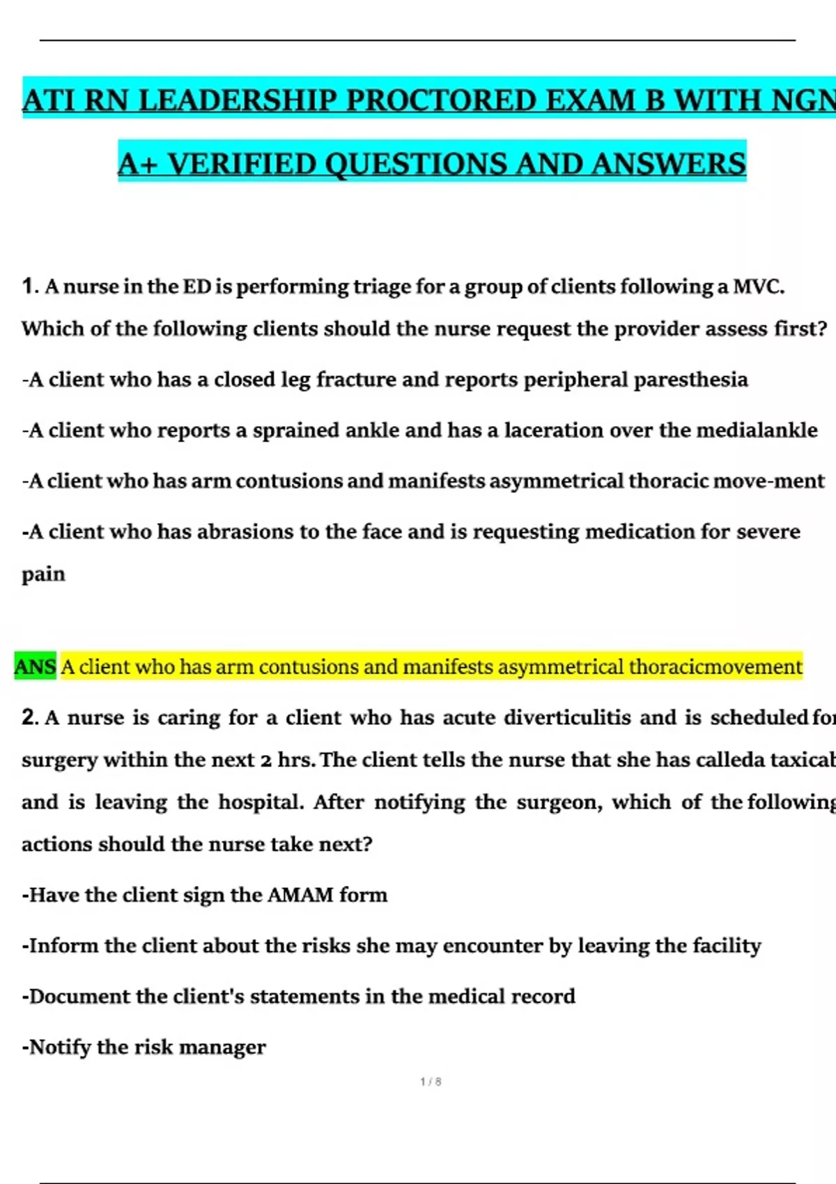 ATI RN LEADERSHIP PROCTORED EXAM B WITH A+ VERIFIED QUESTIONS AND ANSWERS ( V4 )