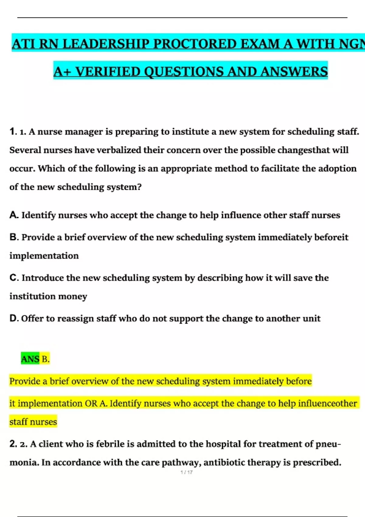 ATI RN LEADERSHIP PROCTORED EXAM A WITH A+ VERIFIED QUESTIONS AND ANSWERS ( V5 )