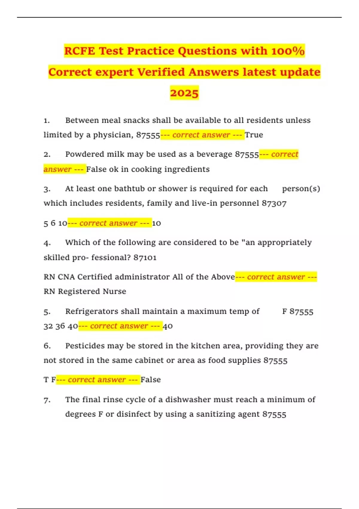 RCFE Test Practice Questions with 100% Correct expert Verified Answers latest update 2025 1. Between meal snacks shall be available to all residents unless limited by a physician, 87555--- correct answer --- True 2. Powdered milk may be used as a beverage 87555--- correct answer --- False ok in cooking ingredients 3. At least one bathtub or shower is required for each person(s) which includes residents, family and live-in personnel 87307 5 6 10--- correct answer --- 10