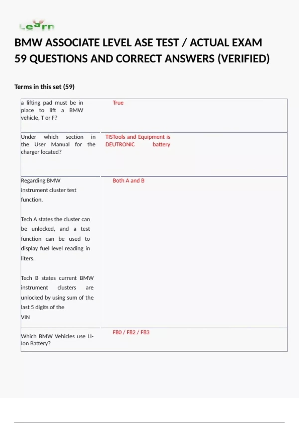 BMW ASSOCIATE LEVEL ASE TEST / ACTUAL EXAM 59 QUESTIONS AND CORRECT ANSWERS (VERIFIED) a lifting pad must be in place to lift a BMW vehicle, T or F? True Under which section in TIS is the User Manual for the DEUTRONIC battery charger located? Tools and Equipment Regarding BMW instrument cluster test function. Tech A states the cluster can be unlocked, and a test function can be used to display fuel level reading in liters. Tech B states current BMW instrument clusters are unlocked by using sum of the last 5 digits of the VIN Both A and B Which BMW Vehicles use LI-Ion Battery? F80 / F82 / F83 When using a floor jack to lift a vehicle, the technician is permitted to lift the rear axle from the Diff Cover, T or F? False Regarding emergency release of park to neutral on 2015 BMW automatic trans. Tech A says it can be released Manually Tech B says it can be released Electrically Both A and B