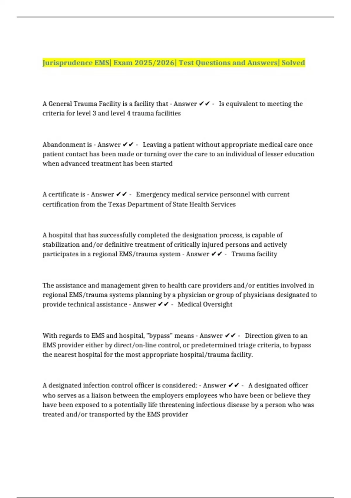 Jurisprudence EMS| Exam 2025/2026| Test Questions and Answers| Solved