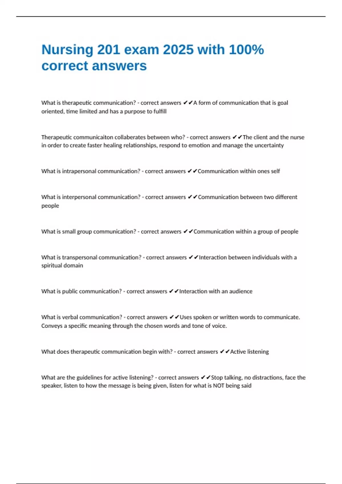 What is therapeutic communication? - correct answers A form of communication that is goal oriented, time limited and has a purpose to fulfill Therapeutic communicaiton collaberates between who? - correct answers The client and the nurse in order to create faster healing relationships, respond to emotion and manage the uncertainty What is intrapersonal communication? - correct answers Communication within ones self What is interpersonal communication? - correct answers Communication between two different people What is small group communication? - correct answers Communication within a group of people What is transpersonal communication? - correct answers Interaction between individuals with a spiritual domain What is public communication? - correct answers Interaction with an audience What is verbal communication? - correct answers Uses spoken or written words to communicate. Conveys a specific meaning through the chosen words and tone of voice. What does therapeutic communication begin with? - correct answers Active listening What are the guidelines for active listening? - correct answers Stop talking, no distractions, face the speaker, listen to how the message is being given, listen for what is NOT being said