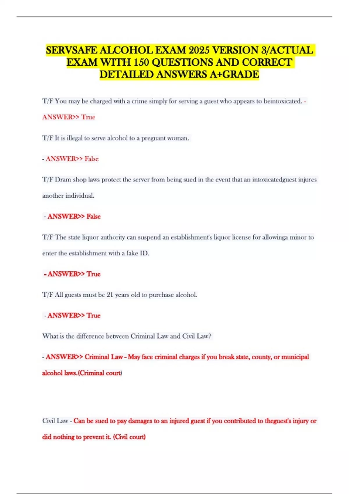 SERVSAFE ALCOHOL EXAM 2025 VERSION 3/ACTUAL EXAM WITH 150 QUESTIONS AND CORRECT DETAILED ANSWERS A+GRADE