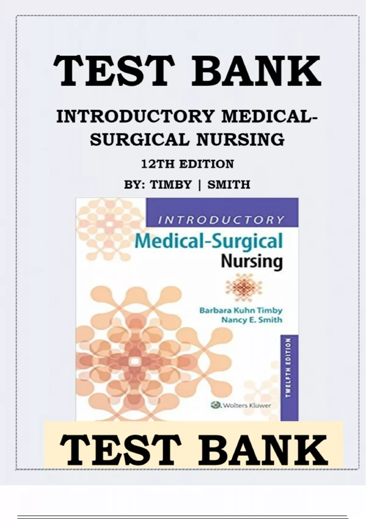 INTRODUCTORY MEDICAL-SURGICAL NURSING 12TH EDITION BY TIMBY SMITH TEST BANK ISBN-1333 This Up to date Test Bank 12th Edition of Introductory Medical-Surgical Nursing is resourceful Pool of Questions and Solutions with Rationalization for all chapters of the book that equips PN/VN students with the practical knowledge and skills necessary to provide safe and effective nursing care to adult medical-surgical clients in today’s changing healthcare environment. Chapter 01: Concepts and Trends in Healthcare, Chapter 02: Settings and Models for Nursing Care Chapter 03: The Nursing Process, NCLEX-Style Chapter 04: Interviewing and Physical Assessment, – Chapter 05: Legal and Ethical Issues, – Chapter 06: Leadership Roles and Management Functions, – Chapter 07: Nurse–Client Relationships, – Chapter 08: Cultural Care Considerations, – Chapter 09: Integrative Medicine and Alternative Therapies, – Chapter 10: End-of-Life Care, – Chapter 11: Pain Management, – Chapter 12: Infection, – Chapter 13: Intravenous Therapy, – Chapter 14: Perioperative Care, – Chapter 15: Disaster Situations, – Chapter 16: Caring for Clients With Fluid, Electrolyte, and Acid-Base Imbalances, – Chapter 17: Caring for Clients in Shock, – Chapter 18: Caring for Clients With Cancer, – Chapter 19: Introduction to the Respiratory System, – Chapter 20: Caring for Clients With Upper Respiratory Disorders, – Chapter 21: Caring for Clients With Lower Respiratory Disorders, – Chapter 22: Introduction to the Cardiovascular System, – Chapter 23: Caring for Clients With Infectious and Inflammatory Disorders of the Heart and Blood Vessels, – Chapter 24: Caring for Clients With Valvular Disorders of the Heart, – Chapter 25: Caring for Clients With Disorders of Coronary and Peripheral Blood Vessels, – Chapter 26: Caring for Clients With Cardiac Arrhythmias, – Chapter 27: Caring for Clients With Hypertension, – Chapter 28: Caring for Clients With Heart Failure, – Chapter 29: Caring for Clients Undergoing Cardiovascular Surgery, – Chapter 30: Introduction to the Hematopoietic and Lymphatic Systems, – Chapter 31: Caring for Clients With Disorders of the Hematopoietic System, – Chapter 32: Caring for Clients With Disorders of the Lymphatic System, – Chapter 33: Introduction to the Immune System, – Chapter 34: Caring for Clients With Immune-Mediated Disorders, – Chapter 35: Caring for Clients With HIV/ AIDS, – Chapter 36: Introduction to the Nervous System, – Chapter 37: Caring for Clients With Central and Peripheral Nervous System Disorders, – Chapter 38: Caring for Clients With Cerebrovascular Disorders, – Chapter 39: Caring for Clients With Head and Spinal Cord Trauma, – Chapter 40: Caring for Clients With Neurologic Deficits, – Chapter 41: Introduction to the Sensory System, – Chapter 42: Caring for Clients With Eye Disorders, – Chapter 43: Caring for Clients With Ear Disorders, – Chapter 44: Introduction to the Gastrointestinal System and Accessory Structures, – Chapter 45: Caring for Clients With Disorders of the Upper Gastrointestinal Tract, – Chapter 46: Caring for Clients With Disorders of the Lower Gastrointestinal Tract, – Chapter 47: Caring for Clients With Disorders of the Liver, Gallbladder, or Pancreas, – Chapter 48: Caring for Clients With Ostomies, – Chapter 49: Introduction to the Endocrine System, – Chapter 50: Caring for Clients With Disorders of the Endocrine System, – Chapter 51: Caring for Clients With Diabetes Mellitus, – Chapter 52: Introduction to the Female and Male Reproductive Systems, – Chapter 53: Caring for Clients With Disorders of the Female Reproductive System, – Chapter 54: Caring for Clients With Breast Disorders, – Chapter 55: Caring for Clients With Disorders of the Male Reproductive System, – Chapter 56: Caring for Clients With Sexually Transmitted Infections, – Chapter 57: Introduction to the Urinary System, – Chapter 58: Caring for Clients With Disorders of the Kidneys and Ureters, – Chapter 59: Caring for Clients With Disorders of the Bladder and Urethra, – Chapter 60: Introduction to the Musculoskeletal System, – Chapter 61: Caring for Clients Requiring Orthopedic Treatment, – Chapter 62: Caring for Clients With Traumatic Musculoskeletal Injuries, – Chapter 63: Caring for Clients With Orthopedic and Connective Tissue Disorders, – Chapter 64: Introduction to the Integumentary System, – Chapter 65: Caring for Clients With Skin, Hair, and Nail Disorders, – Chapter 66: Caring for Clients With Burns, – Chapter 67: Interaction of Body and Mind, – Chapter 68: Caring for Clients With Anxiety Disorders, – Chapter 69: Caring for Clients With Mood Disorders, – Chapter 70: Caring for Clients With Eating Disorders, – Chapter 71: Caring for Clients With Chemical Dependence, – Chapter 72: Caring for Clients With Dementia and Thought Disorders, –