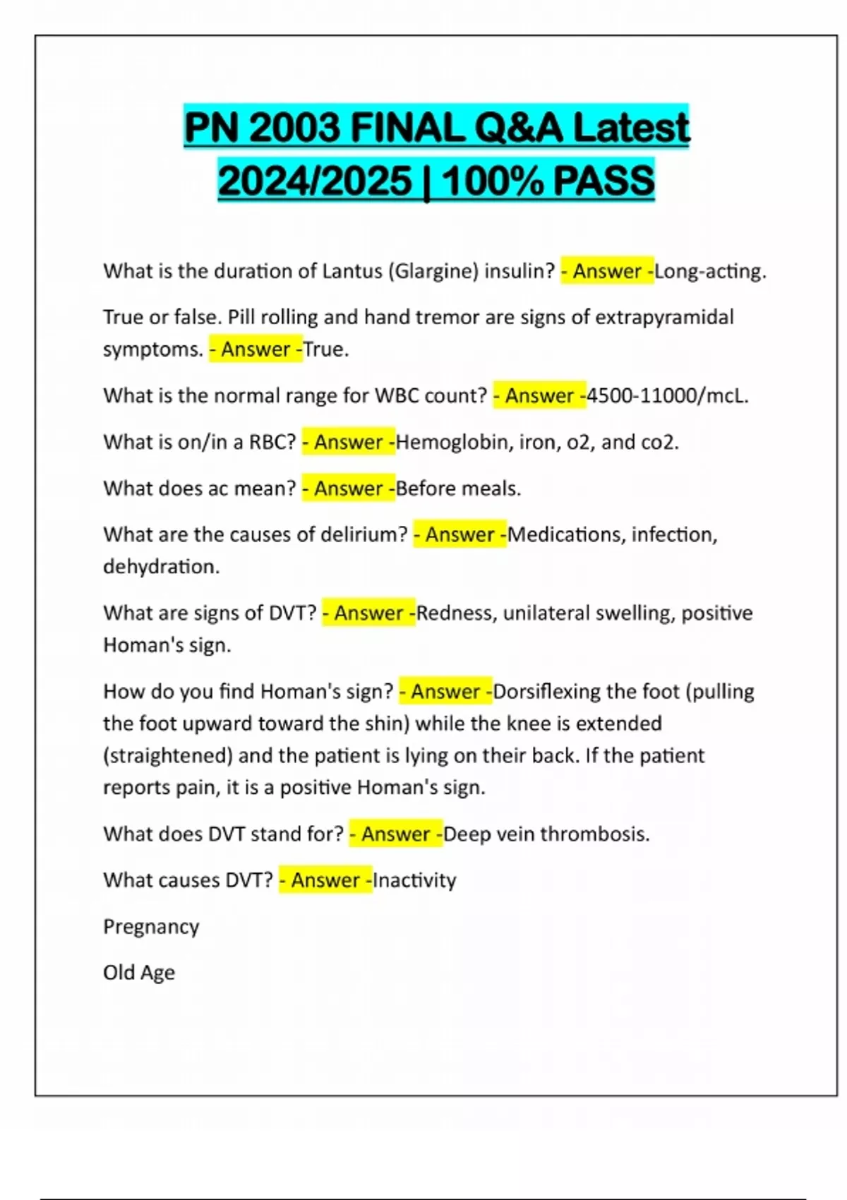 PN 2003 FINAL Q&A Latest 2024/2025 | 100% PASS What is the duration of Lantus (Glargine) insulin? - Answer -Long-acting. True or false. Pill rolling and hand tremor are signs of extrapyramidal symptoms. - Answer -True. What is the normal range for WBC count? - Answer -/mcL. What is on/in a RBC? - Answer -Hemoglobin, iron, o2, and co2. What does ac mean? - Answer -Before meals. What are the causes of delirium? - Answer -Medications, infection, dehydration. What are signs of DVT? - Answer -Redness, unilateral swelling, positive Homan's sign. How do you find Homan's sign? - Answer -Dorsiflexing the foot (pulling the foot upward toward the shin) while the knee is extended (straightened) and the patient is lying on their back. If the patient reports pain, it is a positive Homan's sign. What does DVT stand for? - Answer -Deep vein thrombosis. What causes DVT? - Answer -Inactivity Pregnancy Old AgeObesity