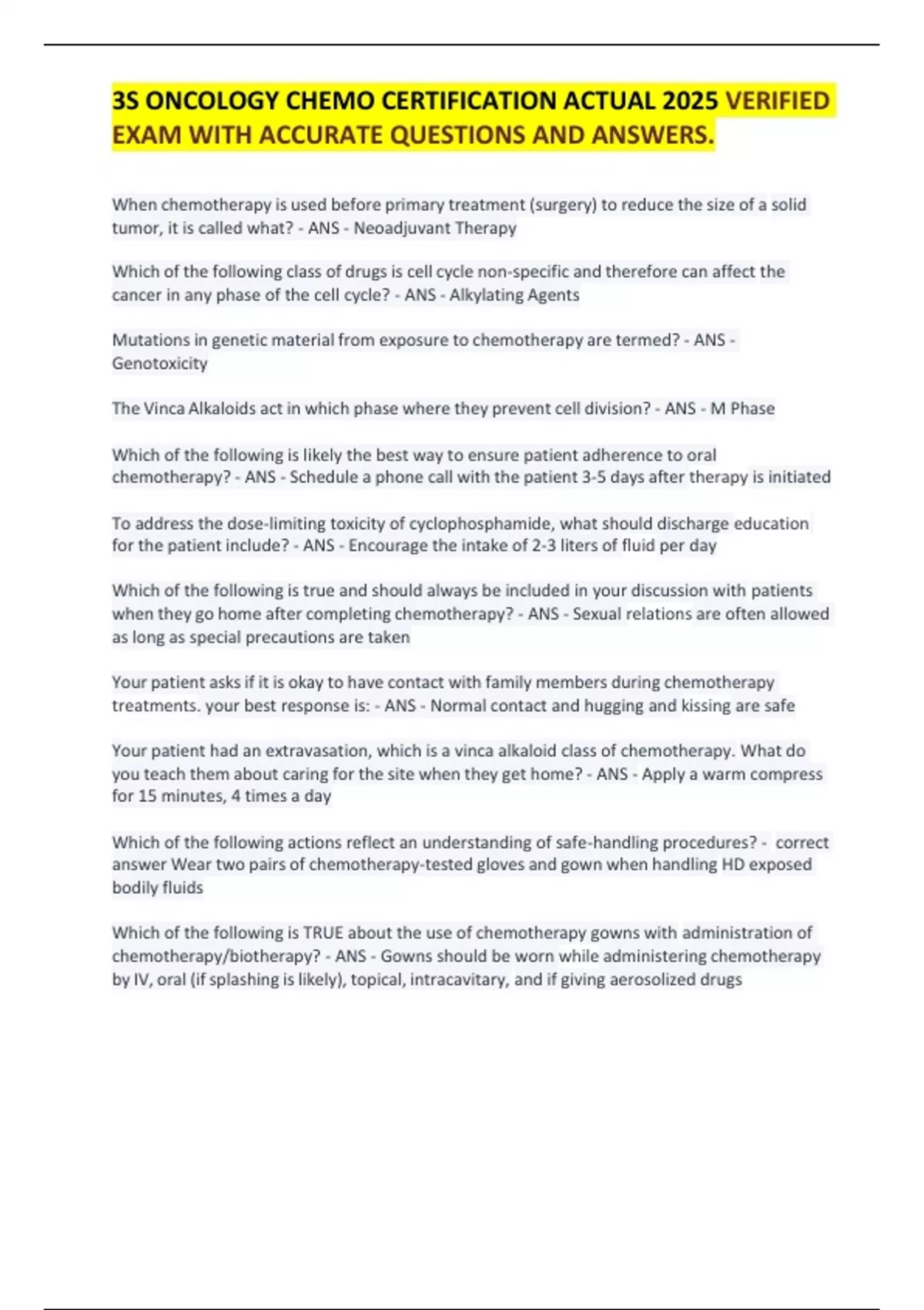 3S ONCOLOGY CHEMO CERTIFICATION ACTUAL 2025 VERIFIED EXAM WITH ACCURATE QUESTIONS AND ANSWERS. When chemotherapy is used before primary treatment (surgery) to reduce the size of a solid tumor, it is called what? - ANS - Neoadjuvant Therapy Which of the following class of drugs is cell cycle non-specific and therefore can affect the cancer in any phase of the cell cycle? - ANS - Alkylating Agents Mutations in genetic material from exposure to chemotherapy are termed? - ANS - Genotoxicity The Vinca Alkaloids act in which phase where they prevent cell division? - ANS - M Phase Which of the following is likely the best way to ensure patient adherence to oral chemotherapy? - ANS - Schedule a phone call with the patient 3-5 days after therapy is initiated To address the dose-limiting toxicity of cyclophosphamide, what should discharge education for the patient include? - ANS - Encourage the intake of 2-3 liters of fluid per day Which of the following is true and should always be included in your discussion with patients when they go home after completing chemotherapy? - ANS - Sexual relations are often allowed as long as special precautions are taken Your patient asks if it is okay to have contact with family members during chemotherapy treatments. your best response is: - ANS - Normal contact and hugging and kissing are safe Your patient had an extravasation, which is a vinca alkaloid class of chemotherapy. What do you teach them about caring for the site when they get home? - ANS - Apply a warm compress for 15 minutes, 4 times a day Which of the following actions reflect an understanding of safe-handling procedures? - correct answer Wear two pairs of chemotherapy-tested gloves and gown when handling HD exposed bodily fluids Which of the following is TRUE about the use of chemotherapy gowns with administration of chemotherapy/biotherapy? - ANS - Gowns should be worn while administering chemotherapy by IV, oral (if splashing is likely), topical, intracavitary, and if giving aerosolized drugs Because of the possibility of exposure through bodily fluids, what is the minimum amount of time to maintain hazardous drug precautions? - ANS - 48 hours The nurse wearing a chemotherapy gown and gloves has assisted in cleaning an incontinent patient with chemotherapy infusing. The gown does not appear soiled. What should be done with the gown? - ANS - Dispose in a yellow chemotherapy waste container Which of the following is true about pregnant nurses who care for patients receiving chemotherapy? - ANS - Employee has the responsibility to notify employer of pregnancy PPE is required when administering chemotherapy using which of the following routes of administration? SATA - ANS - Select all answers. When caring for the patient who is receiving chemotherapy, you notice a puddle of urine beneath the foley bag on the floor. What should be your first action? - ANS - Remove unnecessary people from the area Which of the following may be included in a medical surveillance program? - ANS - Administer periodic questionnaires tracking contact with HD, use of PPE, and adverse events The NCCN guidelines recommend that with the agent you are administering that you should give the following three drug combination as antiemetic premedication: 1. 5-HT3 Antagonist 2. NK1 Antagonist 3. Corticosteroid - ANS - High emetic risk Prior to beginning any chemotherapy treatment, the nurse must perform an assessment where which of the following should occur? - ANS - Discussion with the patient about a history of drug, allergic, or transfusion reactions Certain chemotherapy agents are safely administered intrathecally but which of the following should NEVER be administered intrathecally as it is almost certain to be fatal? - ANS - Vincristine What is the very first thing you should do if you suspect a drug extravasation? - ANS - Stop the infusion Prevention of infection is so important for most oncology patients. Which of the following is no longer recommended to prevent infection? - ANS - Neutropenic Diet Which of the following is true about closed-system transfer devices? - ANS - Use of full PPE is still required If you are administering a chemotherapy agent that is an irritant know to hav