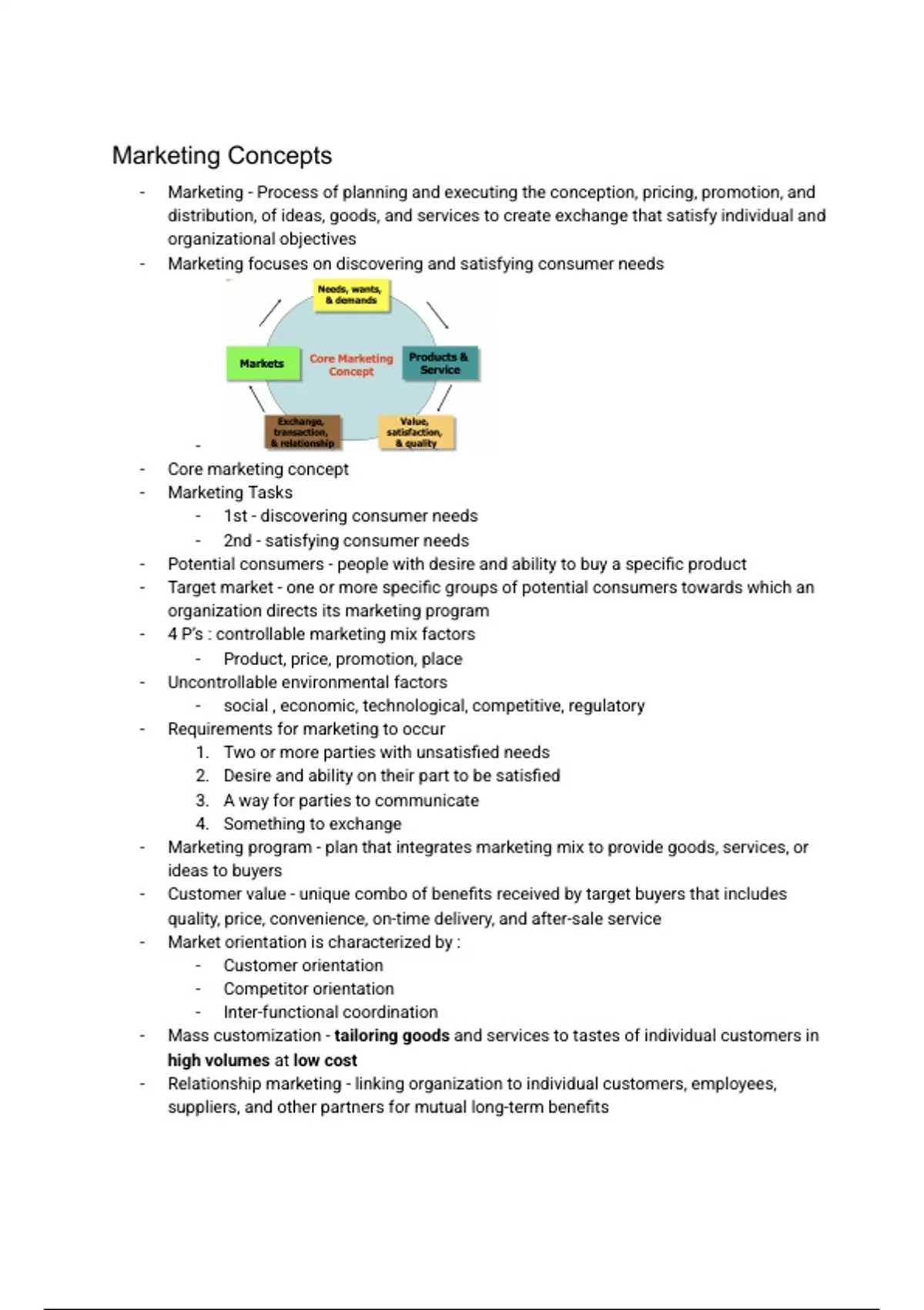 - Marketing program - plan that integrates marketing mix to provide goods, services, or