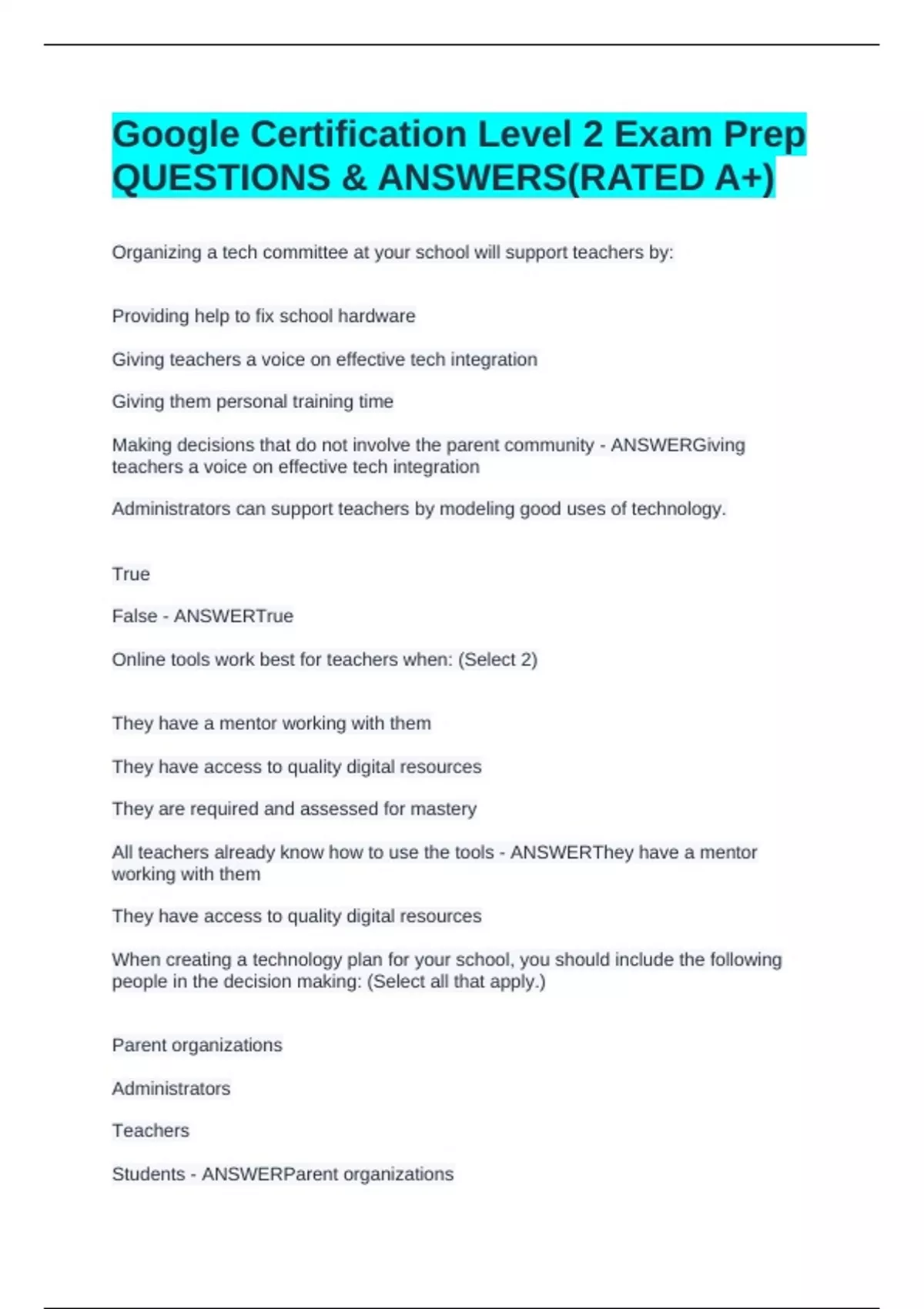 Organizing a tech committee at your school will support teachers by: Providing help to fix school hardware Giving teachers a voice on effective tech integration Giving them personal training time Making decisions that do not involve the parent community - ANSWERGiving teachers a voice on effective tech integration Administrators can support teachers by modeling good uses of technology. True False - ANSWERTrue Online tools work best for teachers when: (Select 2) They have a mentor working with them They have access to quality digital resources They are required and assessed for mastery All teachers already know how to use the tools - ANSWERThey have a mentor working with them They have access to quality digital resources When creating a technology plan for your school, you should include the following people in the decision making: (Select all that apply.) Parent organizations Administrators Teachers Students - ANSWERParent organizations Administrators Teachers Students How can a teacher easily curate their favorite videos? by Emailing them to friends by Creating a YouTube channel with playlists. by Sharing them on social media by Bookmarking favorites - ANSWERby Creating a YouTube channel with playlists. Google Hangouts on Air Can only be viewed live Do not allow for interactive questions Are limited to one hour in length