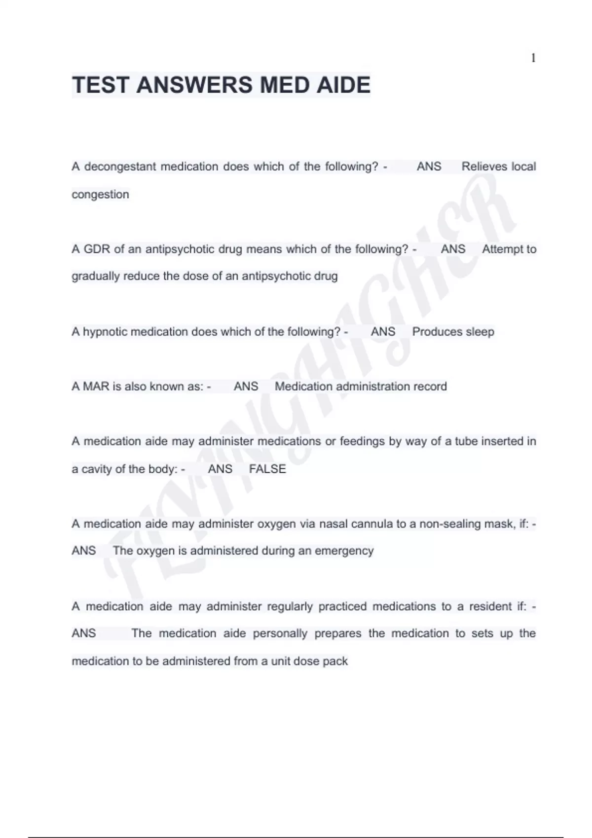 TEST ANSWERS MED AIDE