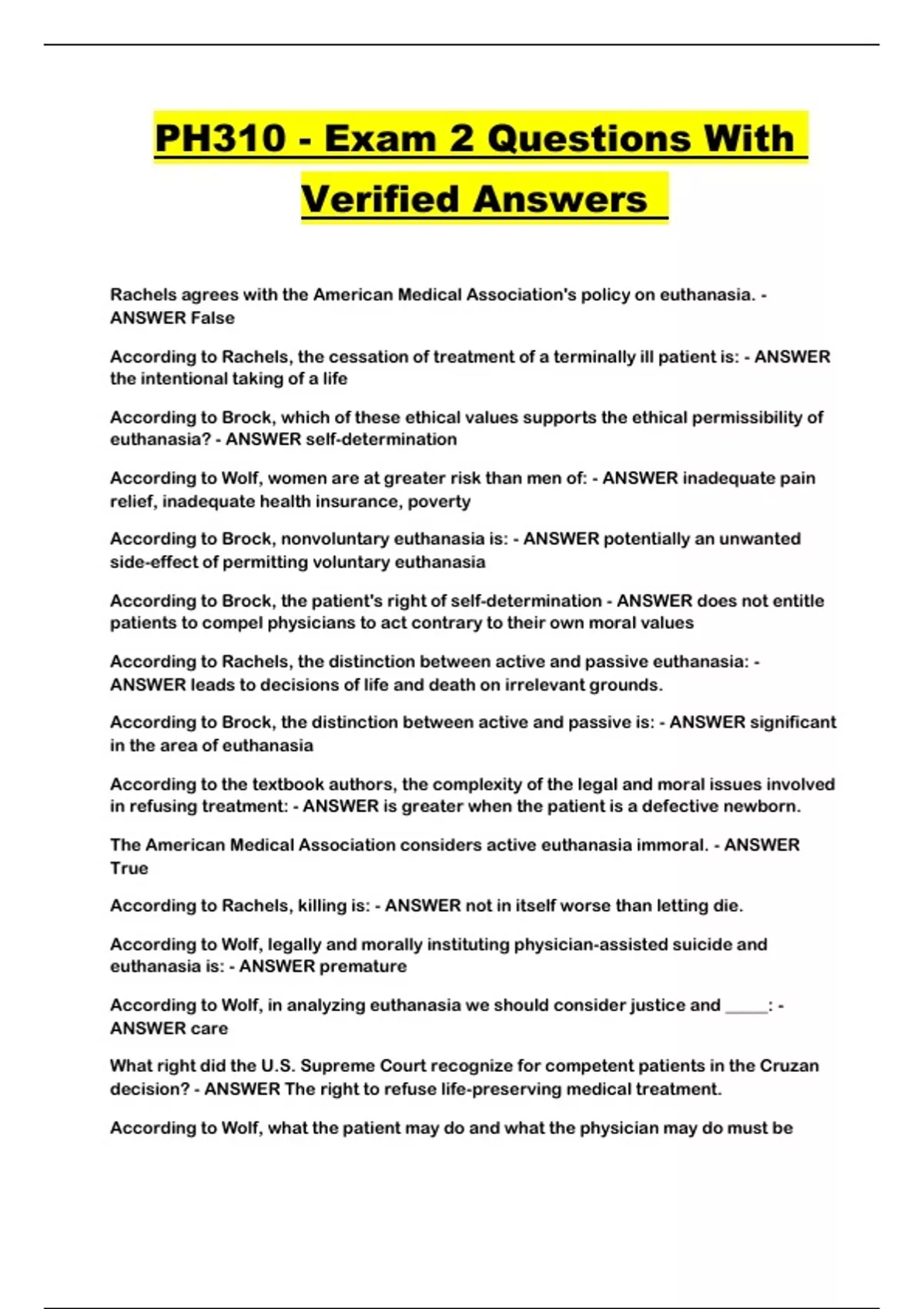 According to Brock, nonvoluntary euthanasia is: - ANSWER potentially an unwanted