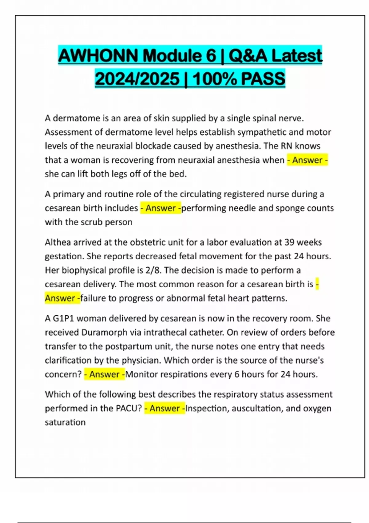 AWHONN Module 6 | Q&A Latest 2024/2025 | 100% PASS A dermatome is an area of skin supplied by a single spinal nerve. Assessment of dermatome level helps establish sympathetic and motor levels of the neuraxial blockade caused by anesthesia. The RN knows that a woman is recovering from neuraxial anesthesia when - Answer - she can lift both legs off of the bed. A primary and routine role of the circulating registered nurse during a cesarean birth includes - Answer -performing needle and sponge counts with the scrub person Althea arrived at the obstetric unit for a labor evaluation at 39 weeks gestation. She reports decreased fetal movement for the past 24 hours. Her biophysical profile is 2/8. The decision is made to
