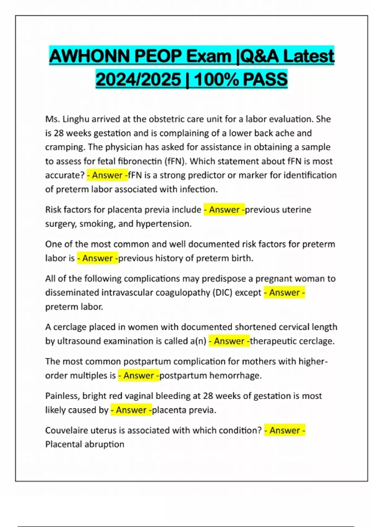 AWHONN PEOP Exam |Q&A Latest 2024/2025 | 100% PASS Ms. Linghu arrived at the obstetric care unit for a labor evaluation. She is 28 weeks gestation and is complaining of a lower back ache and cramping. The physician has asked for assistance in obtaining a sample to assess for fetal fibronectin (fFN). Which statement about fFN is most accurate? - Answer -fFN is a strong predictor or marker for identification of preterm labor associated with infection. Risk factors for placenta previa include - Answer -previous uterine surgery, smoking, and hypertension. One of the most common and well documented risk factors for preterm labor is - Answer -previous history of preterm birth. All of the following complications may predispose a pregnant woman to disseminated intravascular coagulopathy (DIC) except - Answer - preterm labor. A cerclage placed in women with documented shortened cervical length by ultrasound examination is called a(n) - Answer -therapeutic cerclage. The most common postpartum complication for mothers with higherorder multiples is - Answer -postpartum hemor
