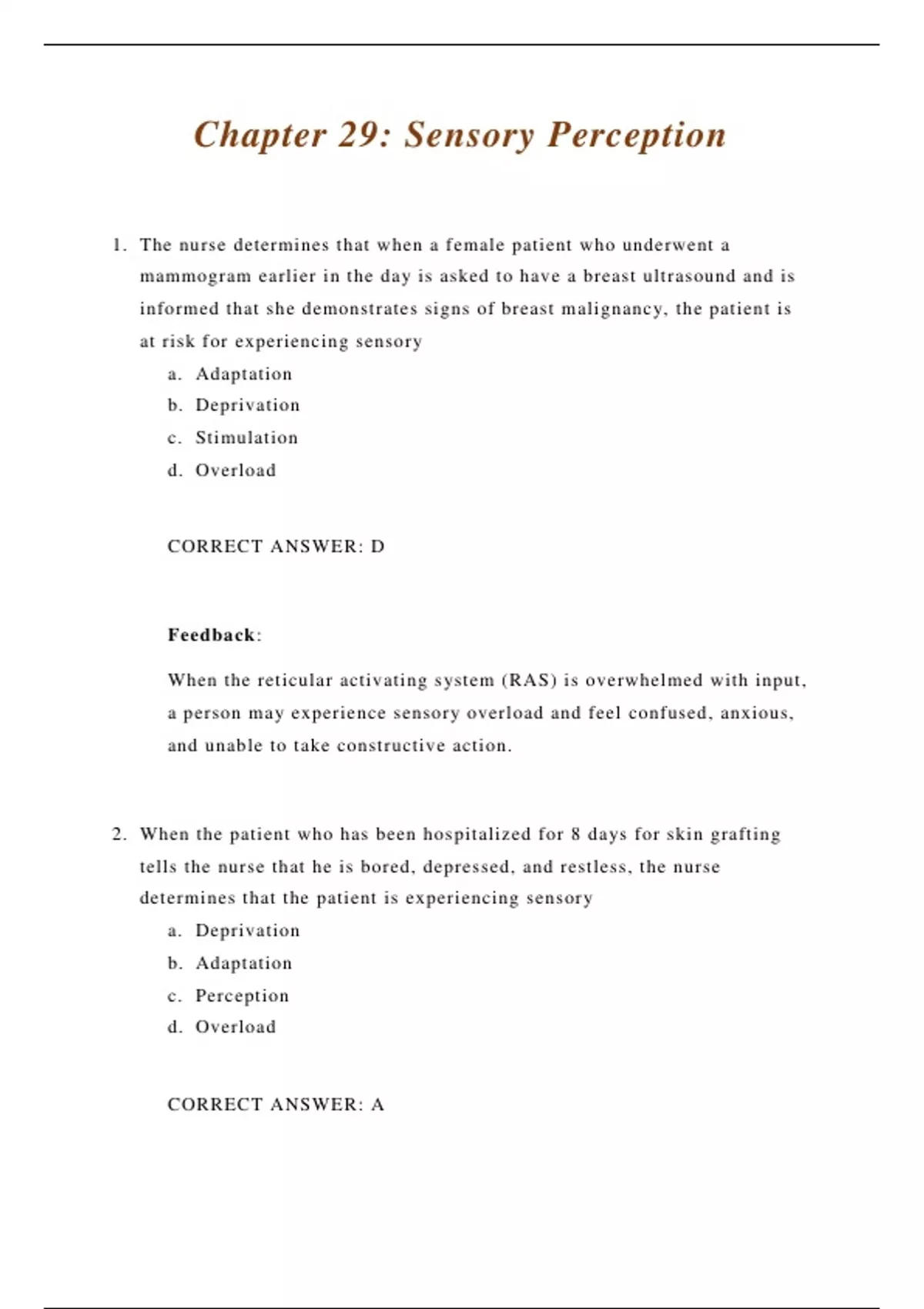 1. The nurse determines that when a female patient who underwent a mammogram earlier in the day is asked to have a breast ultrasound and is informed that she demonstrates signs of breast malignancy, the patient is at risk for experiencing sensory a. Adaptation b. Deprivation c. Stimulation d. Overload CORRECT ANSWER: D Feedback: When the reticular activating system (RAS) is overwhelmed with input, a person may experience sensory overload and feel confused, anxious, and unable to take constructive action. 2. When the patient who has been hospitalized for 8 days for skin grafting tells the nurse that he is bored, depressed, and restless, the nurse determines that the patient is experiencing sensory a. Deprivation b. Adaptation c. Perception d. Overload CORRECT ANSWER: A Feedback: When the RAS fails to recognize a stimulus because it is below the threshold level or lacks relevant meaning to the person, sensory deprivation may occur, and the person experiences boredom, depression, restlessness, and vivid sensual imagery, including hallucinations. 3. The nurse taking care of a 3-year-old who is on a 10-regimen dose of gentamicin should instruct the mother to a. Have the vision tested in 6 weeks b. Have the gentamicin levels tested in 6 weeks c. Have the peripheral nervous system tested in 6 weeks d. Have the hearing tested in 6 weeks