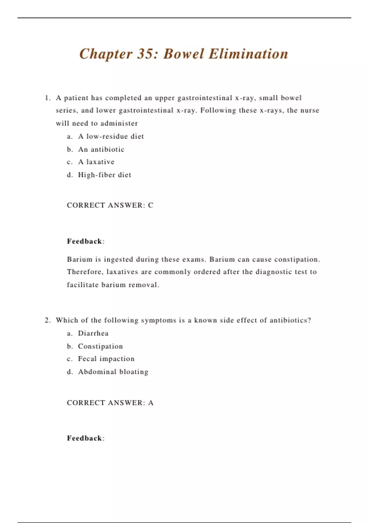 1. A patient has completed an upper gastrointestinal x-ray, small bowel series, and lower gastrointestinal x-ray. Following these x-rays, the nurse will need to administer a. A low-residue diet b. An antibiotic c. A laxative d. High-fiber diet CORRECT ANSWER: C Feedback: Barium is ingested during these exams. Barium can cause constipation. Therefore, laxatives are commonly ordered after the diagnostic test to facilitate barium removal. 2. Which of the following symptoms is a known side effect of antibiotics? a. Diarrhea b. Constipation c. Fecal impaction d. Abdominal bloating CORRECT ANSWER: A Feedback: A side effect of taking antibiotics is diarrhea. Constipation, fecal impaction and abdominal bloating are not common side effects of antibiotics. 3. Which of the following medications causes constipation? a. Magnesium antacids b. Dulcolax c. Aspirin d. Iron supplements