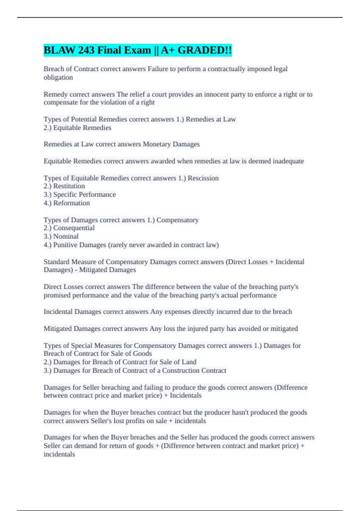Types of Damages correct answers 1.) Compensatory