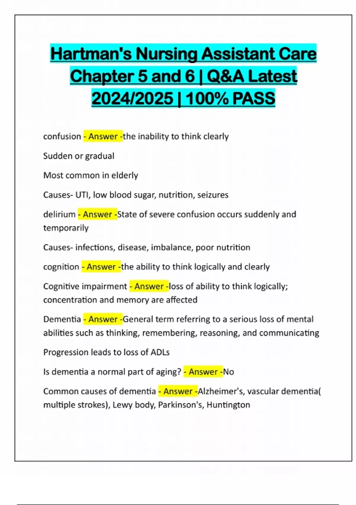 Hartman's Nursing Assistant Care Chapter 5 and 6 | Q&A Latest 2024/2025 | 100% PASS confusion - Answer -the inability to think clearly Sudden or gradual Most common in elderly Causes- UTI, low blood sugar, nutrition, seizures delirium - Answer -State of severe confusion occurs suddenly and temporarily Causes- infections, disease, imbalance, poor nutrition cognition - Answer -the ability to think logically and clearly Cognitive impairment - Answer -loss of ability to think logically; concentration and memory are affected Dementia - Answer -General term referring to a serious loss of mental abilities such as thinking, remembering, reasoning, and communicating Progression leads to loss of ADLs Is dementia a normal part of