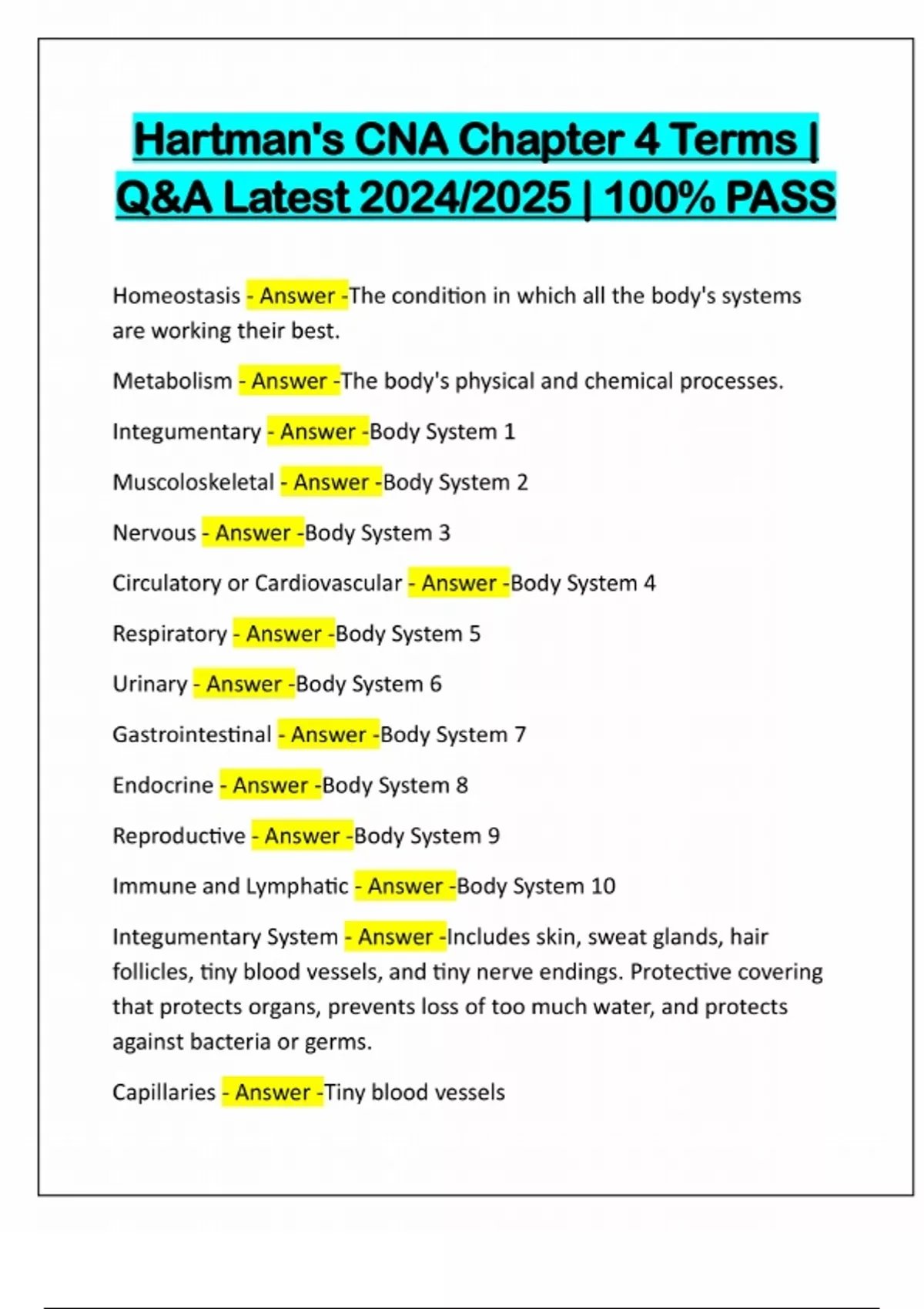 Hartman's CNA Chapter 4 Terms | Q&A Latest 2024/2025 | 100% PASS Homeostasis - Answer -The condition in which all the body's systems are working their best. Metabolism - Answer -The body's physical and chemical processes. Integumentary - Answer -Body System 1 Muscoloskeletal - Answer -Body System 2 Nervous - Answer -Body System 3 Circulatory or Cardiovascular - Answer -Body System 4 Respiratory - Answer -Body System 5 Urinary - Answer -Body System 6 Gastrointestinal - Answer -Body System 7 Endocrine - Answer -Body System 8 Reproductive - Answer -Body System 9 Immune and Lymphatic - Answer -Body System 10 Integumentary System - Answer -Includes skin, sweat glands, hair follicles, tiny blood vessels, and