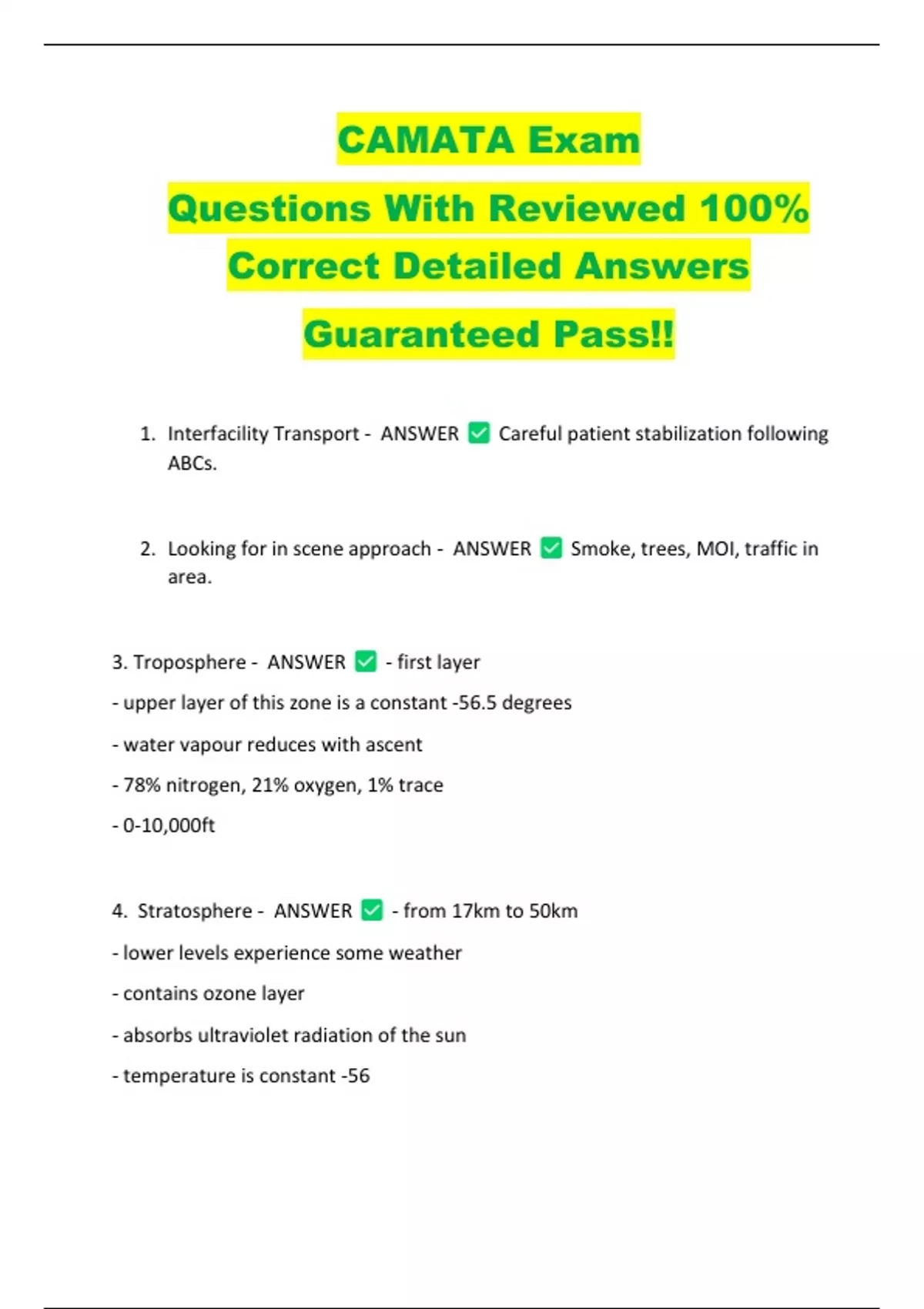 CAMATA Exam Questions With Reviewed 100% Correct Detailed Answers Guaranteed Pass! Mesosphere - ANSWER - from 50-80km - temperature reaches its coldest at -90 - meteors generally burn up here 6. Thermosphere - ANSWER - 85-700km - 2000 degrees from solar radiation 7. Exosphere - ANSWER -transitions into space - final layer 8. Atmospheric Pressure - ANSWER degrees in dry air at sea level. 9. Greatest Density Change - ANSWER sea level. 10. Efficient Zone - ANSWER 760mmHg at a temperature of 15 Between sea level and 5000ft above - sea level to 10,000 ft - physiological environment - barometric pressure drops from 760mmHg to 523mmHg at 10,000ft 11. Deficient Zone - ANSWER - from 10,000ft to 50,000ft - requires supplemental oxygen or cabin pressurized systems - barometric pressure approx. 87mmHg - human body cannot survive unless in pressurized environment 12. Space Equivalent Zone - ANSWER fringes of atmosphere - totally hostile to human life - requires pressurized aircraft - 50,000ft and continuing to outer - boiling point of water drops to body temperature - unsurvivable 13. Aircraft Pressurization - ANSWER Engines introduce ambient air into a compressor. The compressed air heats up and must be cooled before being introduced into the cabin. 14. Pressurized Aircraft - ANSWER - longer runways required - complex maintenance - higher altitudes - fly above weather - faster speeds - generally longer range - less turbulence - less oxygen required - stable cabin temperature - expensive to build 15. Unpressurized Aircraft - ANSWER - lower cost to manufacture - short and unimproved runways may be an option - altitudes restricted to physiologic zone - slower speed - shorter range - exposed to turbulence - require supplemental oxygen at higher altitudes - less protection from extreme heat or cold - increased cabin noise 16. Environmental Stressors of Flight - ANSWER - acclimatization - rate of ascent - duration of exposure - physical activity - tempurature