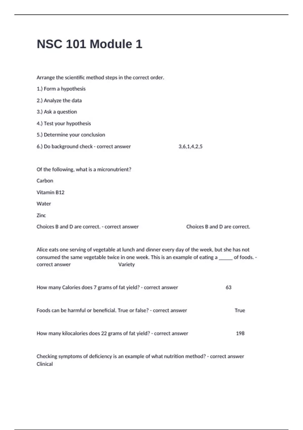 Arrange the scientific method steps in the correct order. 1.) Form a hypothesis 2.) Analyze the data 3.) Ask a question 4.) Test your hypothesis 5.) Determine your conclusion 6.) Do background check - correct answer 3,6,1,4,2,5 Of the following, what is a micronutrient? Carbon Vitamin B12 Water Zinc Choices B and D are correct. - correct answer Choices B and D are correct. Alice eats one serving of vegetable at lunch and dinner every day of the week, but she has not consumed the same vegetable twice in one week. This is an example of eating a _____ of foods. - correct answer Variety How many Calories does 7 grams of fat yield? - correct answer 63 Foods can be harmful or beneficial. True or false? - correct answer True How many kilocalories does 22 grams of fat yield? - correct answer 198 Checking symptoms of deficiency is an example of what nutrition method? - correct answer Clinical Which of the following are fat-soluble vitamins? Vitamin C None of these choices are correct. Vitamin K Folate Niacin - correct answer Vitamin K Only the US customary system is used in nutrition. True or false? - correct answer False Which of the following does NOT yield energy? Carbohydrates Water Fats Protein - correct answer Water The first step in the scientific method usually involves identifying relationships between personal characteristics. developing a question. gathering data. making observations. - correct answer Making Observations Measurement of height and weight falls under what method of nutrition assessment? - correct answer Anthropometry Nutritionists measure food energy in: - correct answer Calories Three of the six classes of nutrients our body needs are energy yielding nutrients. They are: - correct answer Fats, carbohydrates and proteins What is food quality influenced by? Appearance Taste Microbial content All of the choices are correct - correct answer All of the choices are correct How many calories does 9 grams of carbohydrates yield? - correct answer 36 The Acceptable Macronutrient Distribution Range for fat is - correct answer 20-35% Which should be the first step of research when using the scientific method? reporting results analyzing data noting an observation writing an article - correct answer Noting an observation Epidemiological research studies can show relationships such as between diet and health. True or False? - correct answer False Looking at a 24-h recall is an example of what nutrition assessment method? - correct answer Dietary Epidemiological research looks at populations of people. True or false? - correct answer True Which are NOT classified as nutrients? minerals vitamins proteins phytochemicals - correct answer Phytochemicals All of the following are functions of lipids, EXCEPT: Provide insulation Catalyze chemical reactions of the body Surround and protect organs All of the choices are correct - correct answer Catalyze chemical reactions of the body Which of the following nutrients is a source of energy? vitamin D iron protein cholesterol - correct answer Protein Providing energy is a main function of protein. True or False? - correct answer False Observational research studies can show cause and effect in the results. True or False? - correct answer False A study that looks at trends among populations is known as a (n): Epidemiological Study Intervention Study Laboratory Study Case Study - correct answer Epidemiological Study Which of the following statements is an example of an observation? Patients with scurvy are given vitamin C supplements, instead of lemons for treatment. Lemons cure scurvy because of its vitamin C content, thus scurvy is due to deficiency in vitamin C. Patients with scurvy were found with low levels of vitamin C. Lemons are an old cure for scurvy. - correct answer Lemons are an old cure for scurvy. All of the following are fat-soluble vitamins, EXCEPT: Vitamin E Vitamin B12 All choices are fat-soluble vitamins. Vitamin D - correct answer Vitamin B12 Which statement is false regarding micronutrients? Many minerals inhibit absorption of others Vitamins are organic Minerals are not vulnerable to degradation by heat and light Minerals can be fat- or water-soluble. - correct answer Minerals can be fat- or water-soluble. A macronutrient is a nutrient - correct answer That is needed in large amounts in the diet. What is an example of a simple carbohydrate? Sucrose Glucose Starch Choices a and b are correct. Choices a, b, and c are correct. - correct answer Choices a and b are correct. What is NOT a factor of health? Inte