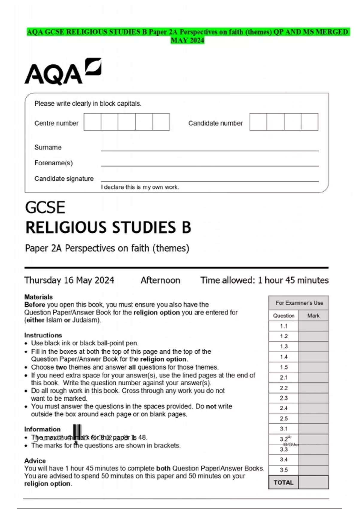 AQA GCSE RELIGIOUS STUDIES B Paper 2A Perspectives on faith (themes) QP AND MS MERGED MAY 2024