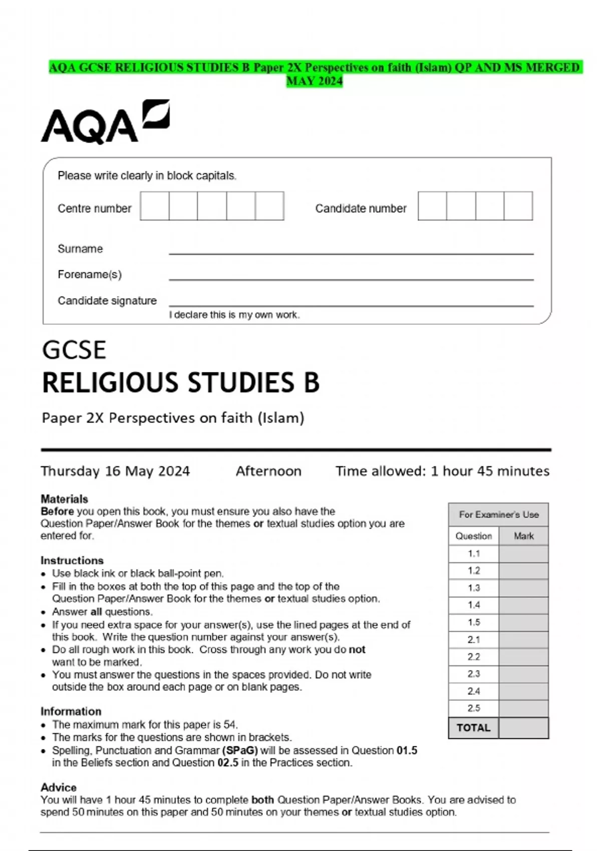AQA GCSE RELIGIOUS STUDIES B Paper 2X Perspectives on faith (Islam) QP AND MS MERGED MAY 2024