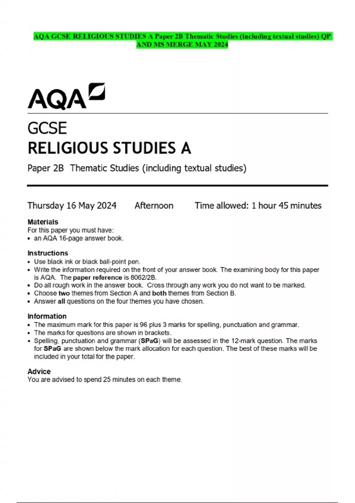 AQA GCSE RELIGIOUS STUDIES A Paper 2B Thematic Studies (including textual studies) QP AND MS MERGE MAY 2024