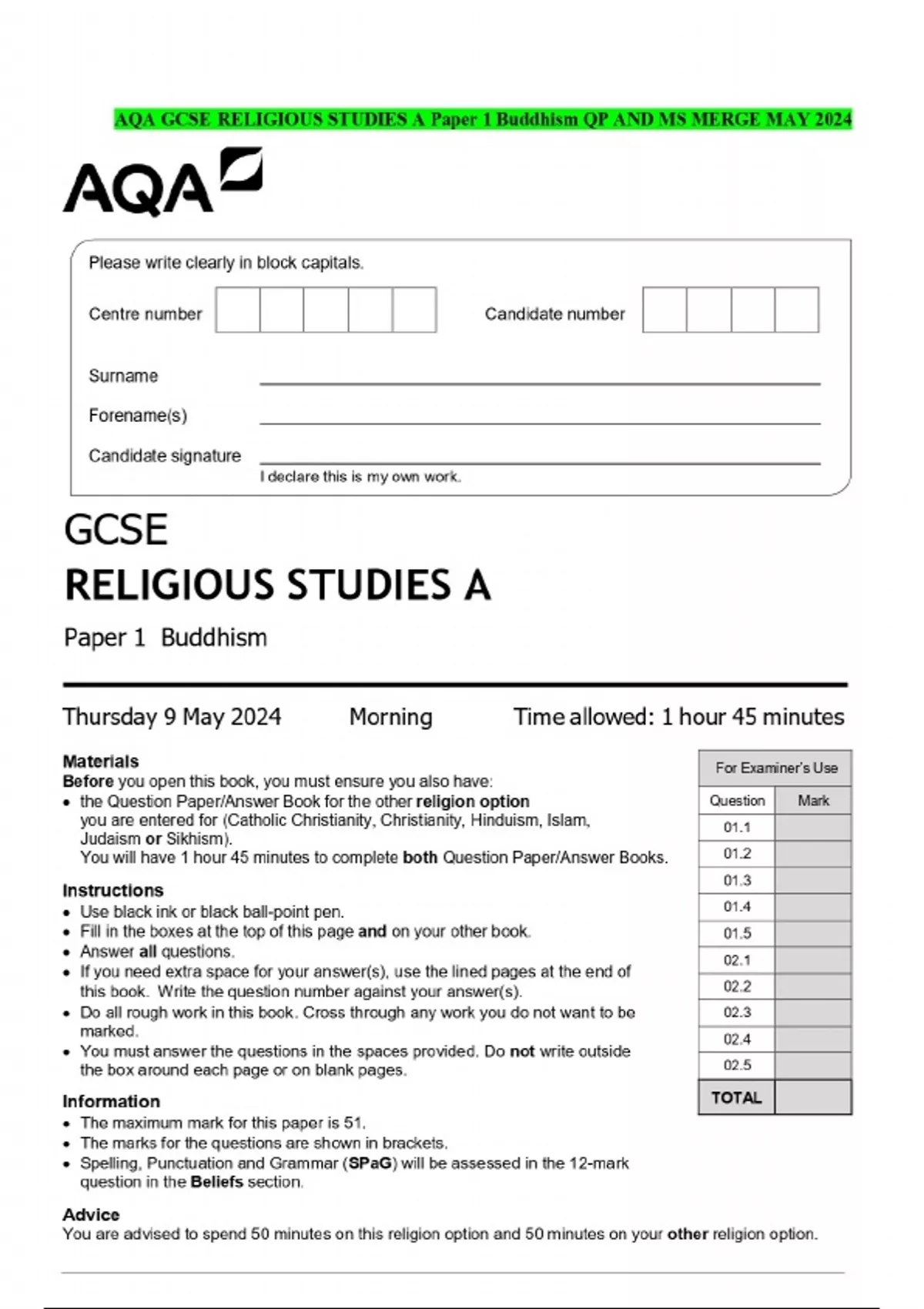 AQA GCSE RELIGIOUS STUDIES (SHORT COURSE) QP AND MS MERGE 2024