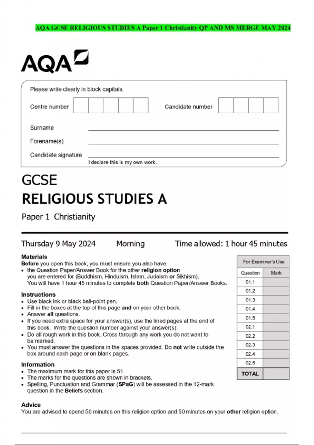 AQA GCSE RELIGIOUS STUDIES A Paper 1 Christianity QP AND MS MERGE MAY 2024