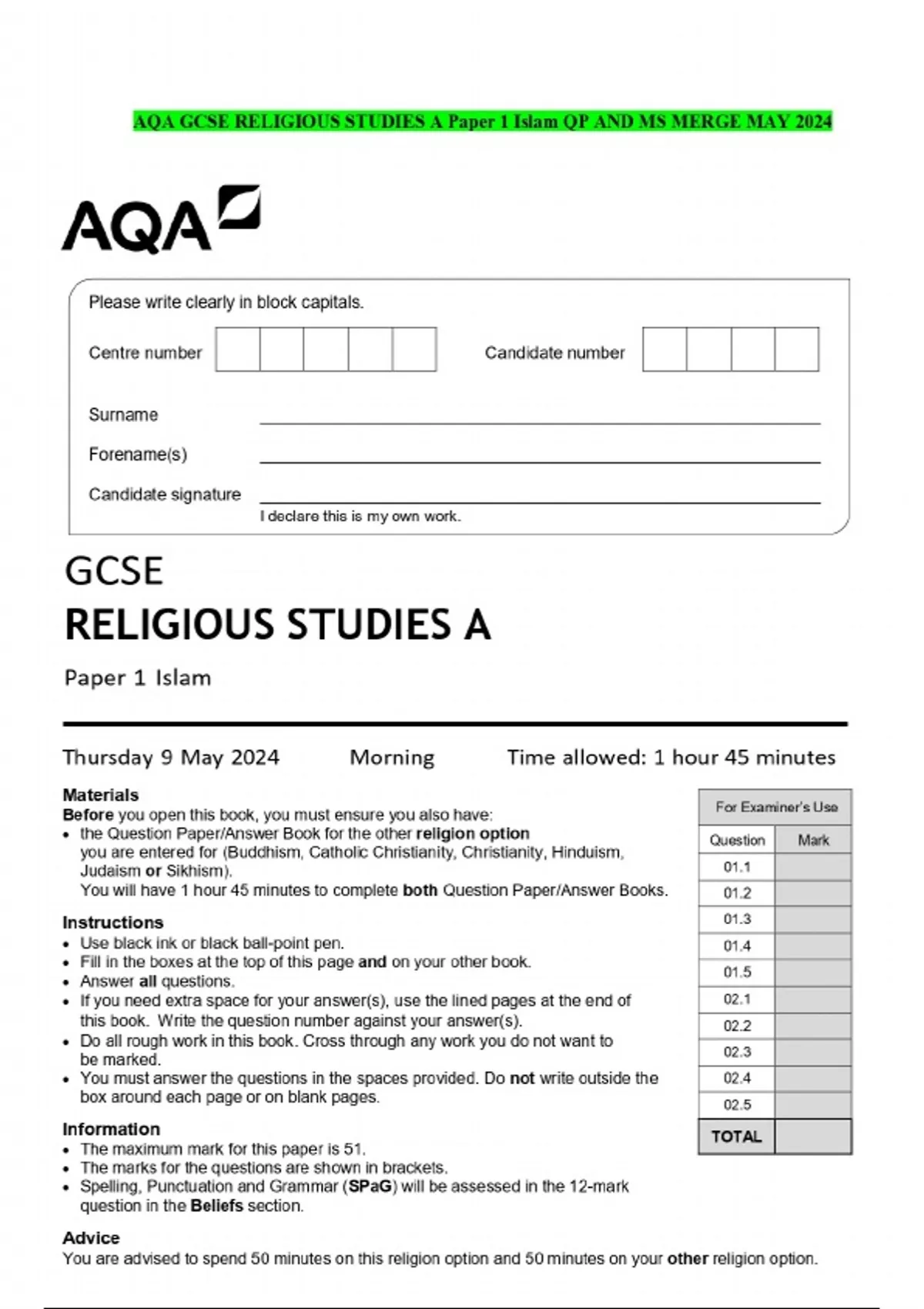 AQA GCSE RELIGIOUS STUDIES A Paper 1 Islam QP AND MS MERGE MAY 2024
