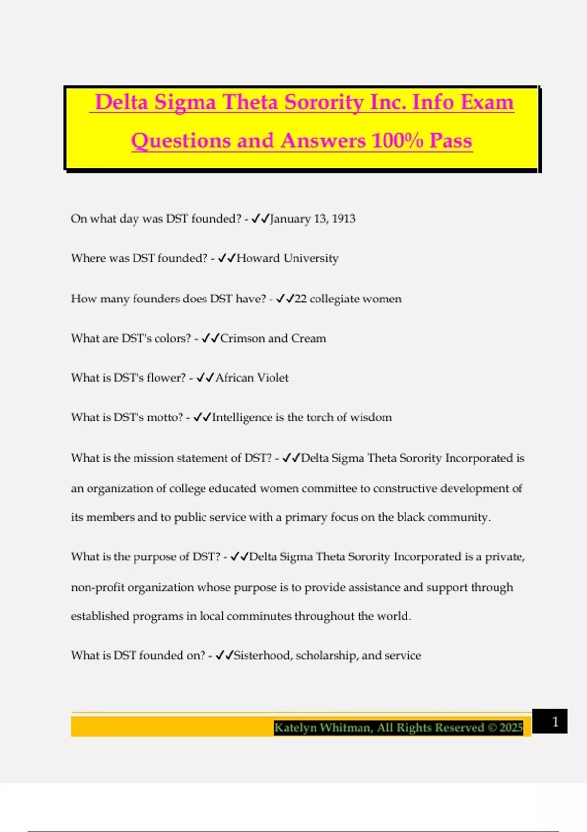 Delta Sigma Theta Sorority Inc. Info Exam Questions and Answers 100% Pass