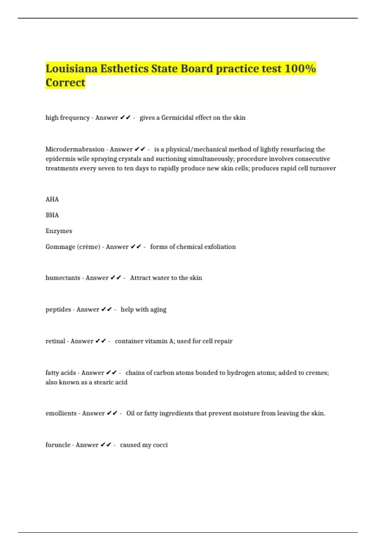emollients - Answer ✔✔ - Oil or fatty ingredients that prevent moisture from leaving the skin.