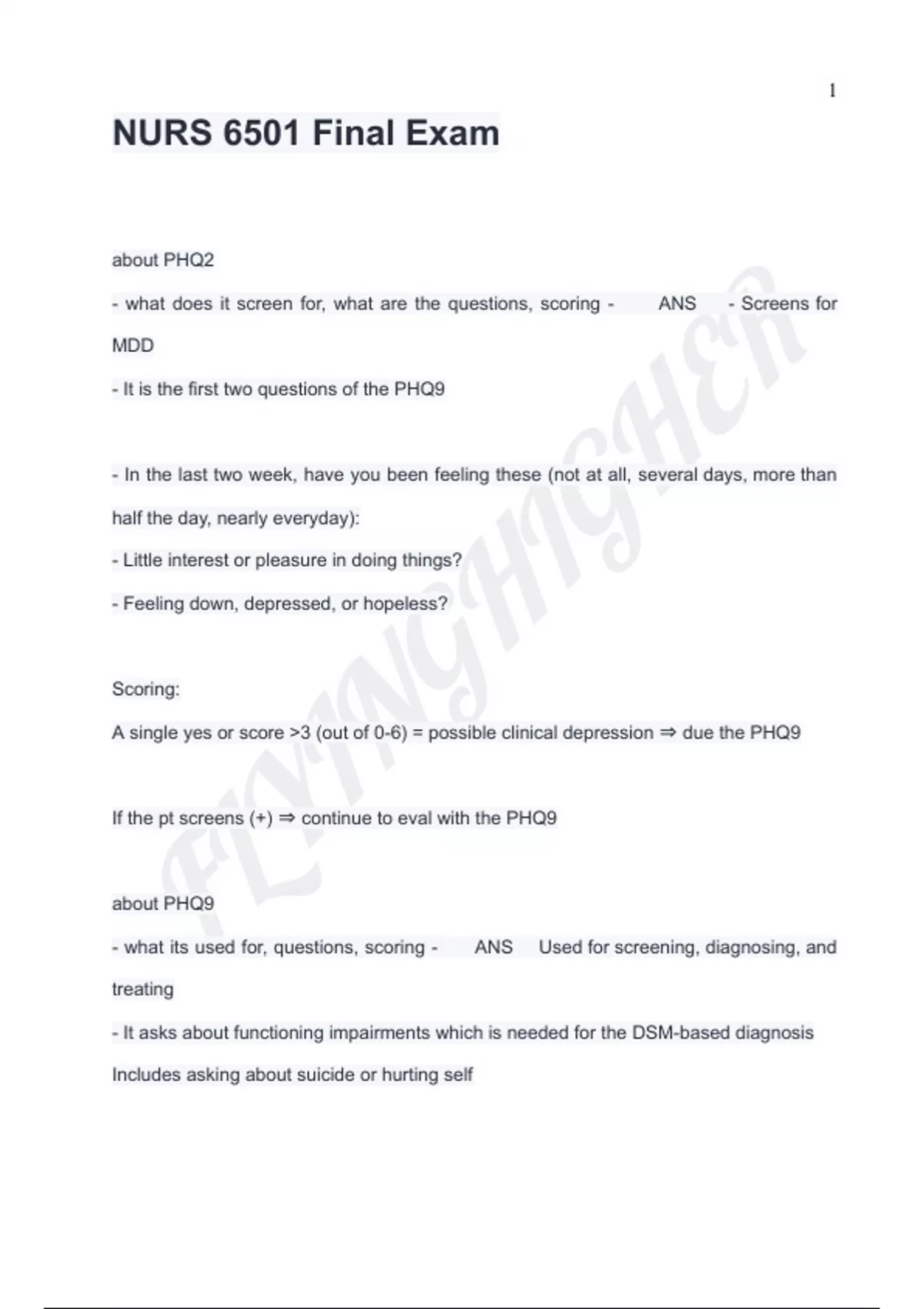 - what its used for, questions, scoring - ANS Used for screening, diagnosing, and