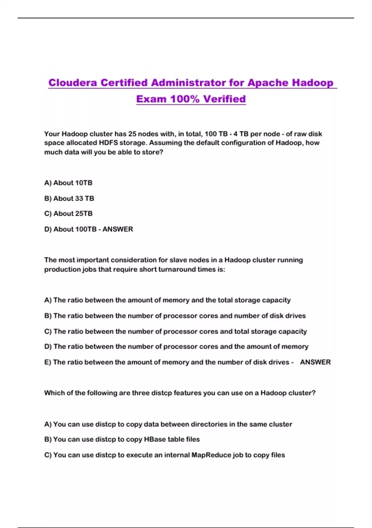 Cloudera Certified Administrator for Apache Hadoop Exam 100% Verified...