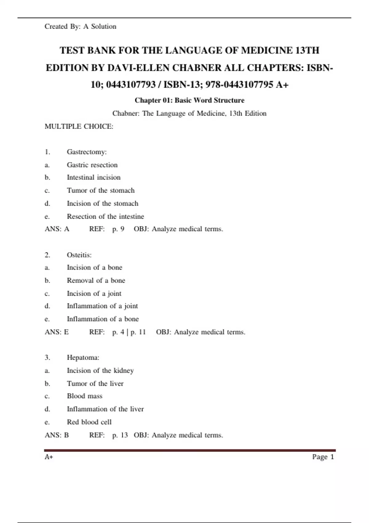 TEST BANK FOR THE LANGUAGE OF MEDICINE 13TH EDITION BY DAVI-ELLEN CHABNER ALL CHAPTERS: ISBN-10; / ISBN-13; 978-0443107795 A+ Chapter 01: Basic Word StructureTEST BANK FOR THE LANGUAGE OF MEDICINE 13TH EDITION BY DAVI-ELLEN CHABNER ALL CHAPTERS: ISBN-10; / ISBN-13; 978-0443107795 A+ Chapter 01: Basic Word Structure